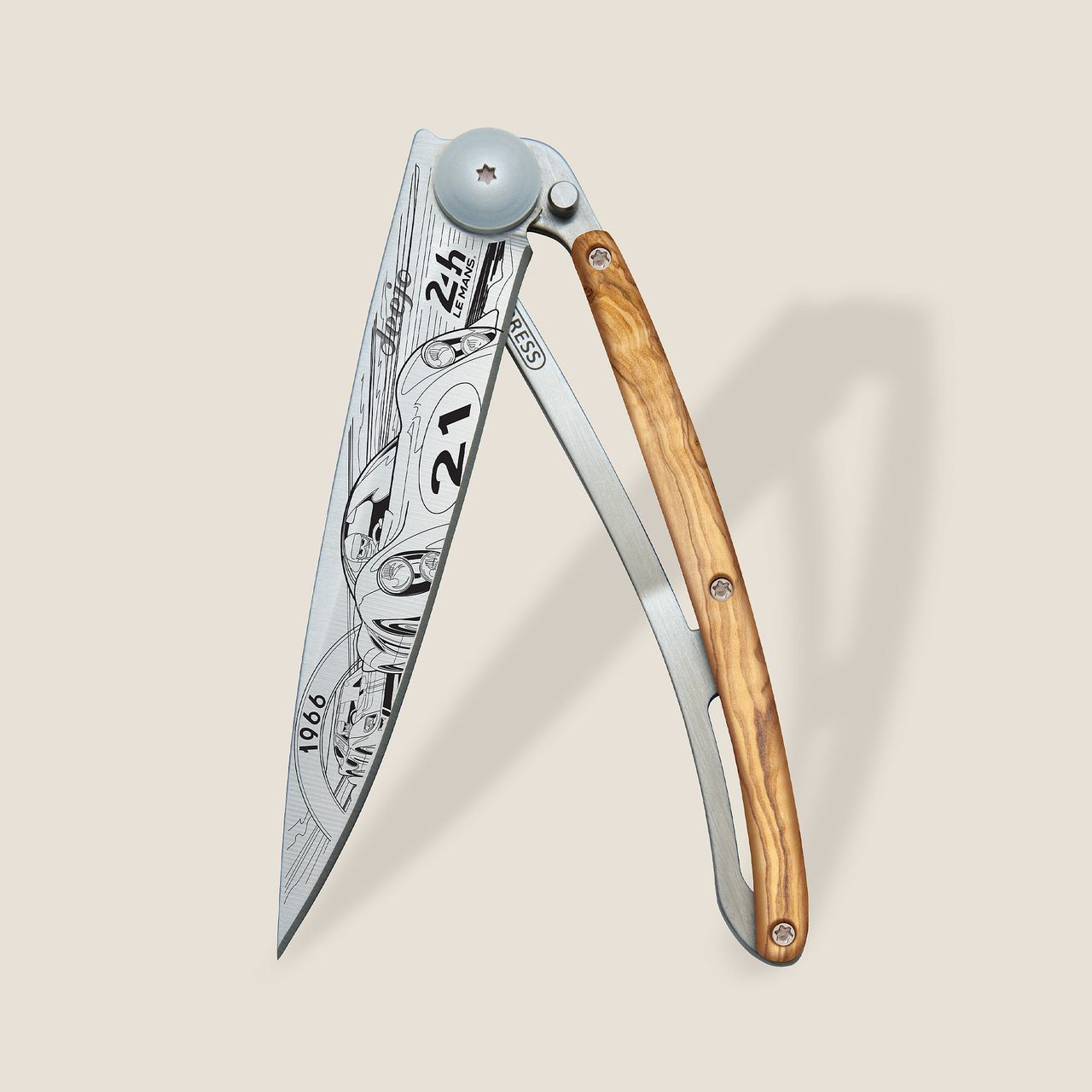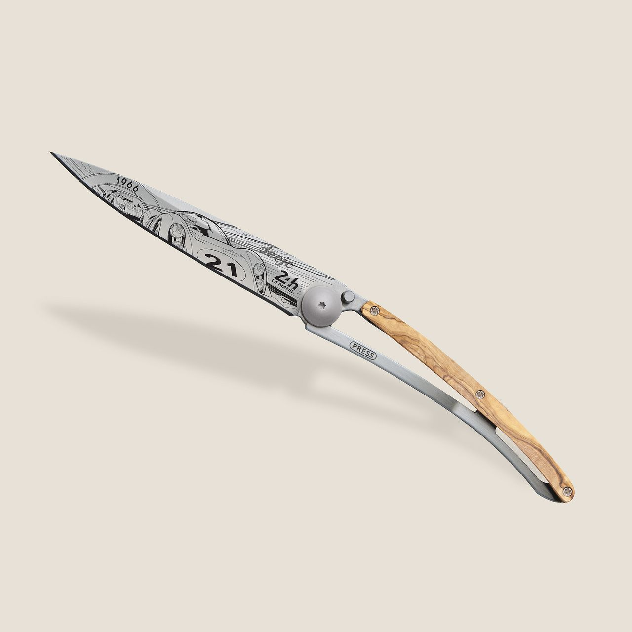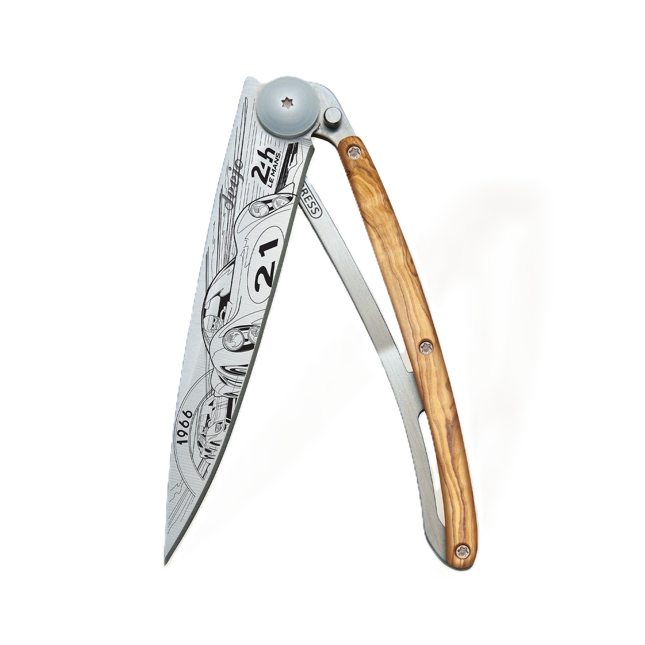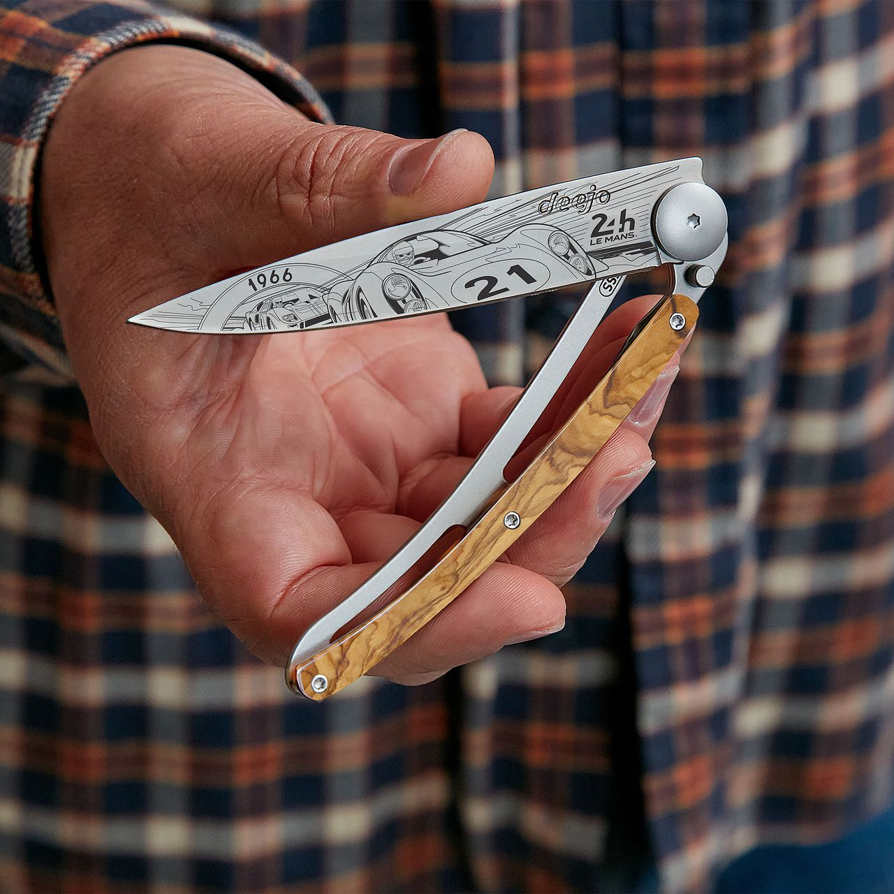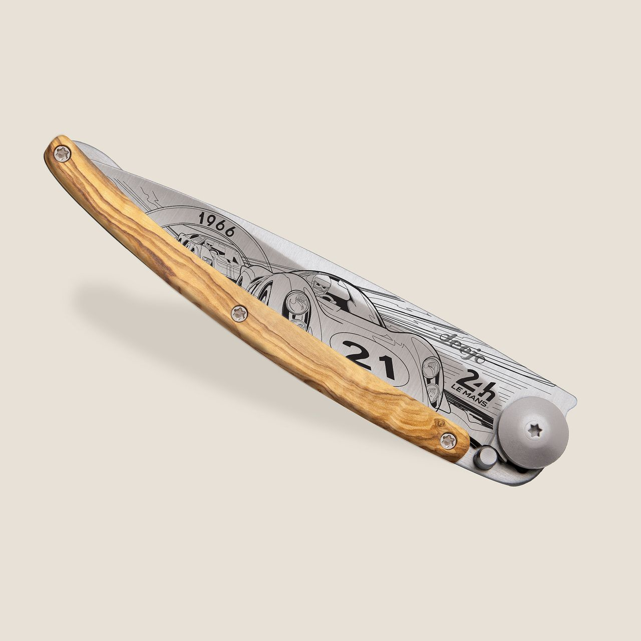 <p>Stylový ultralehký nůž Deejo se střenkou z olivového dřeva a motivem 24 h Le Mans 1966.</p>