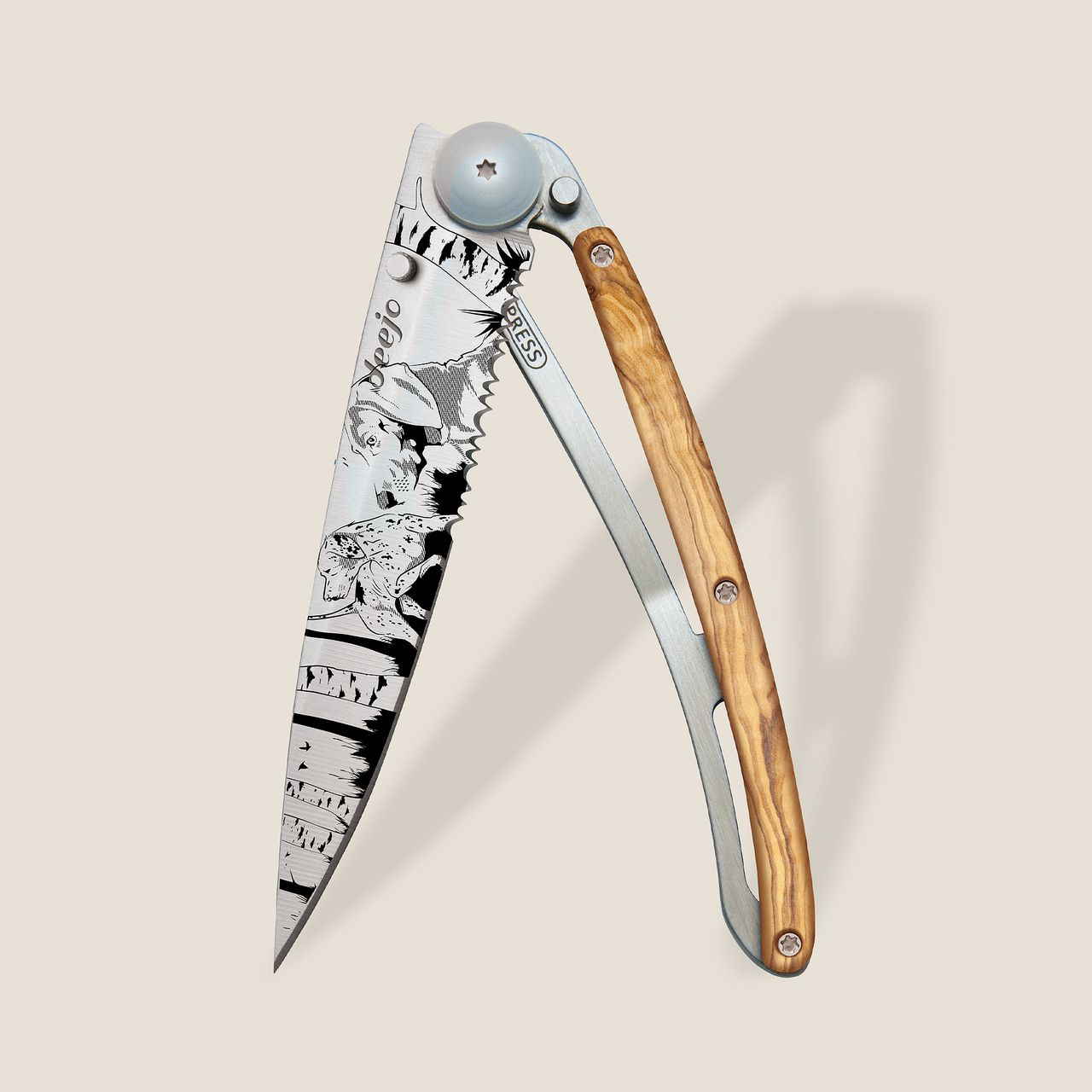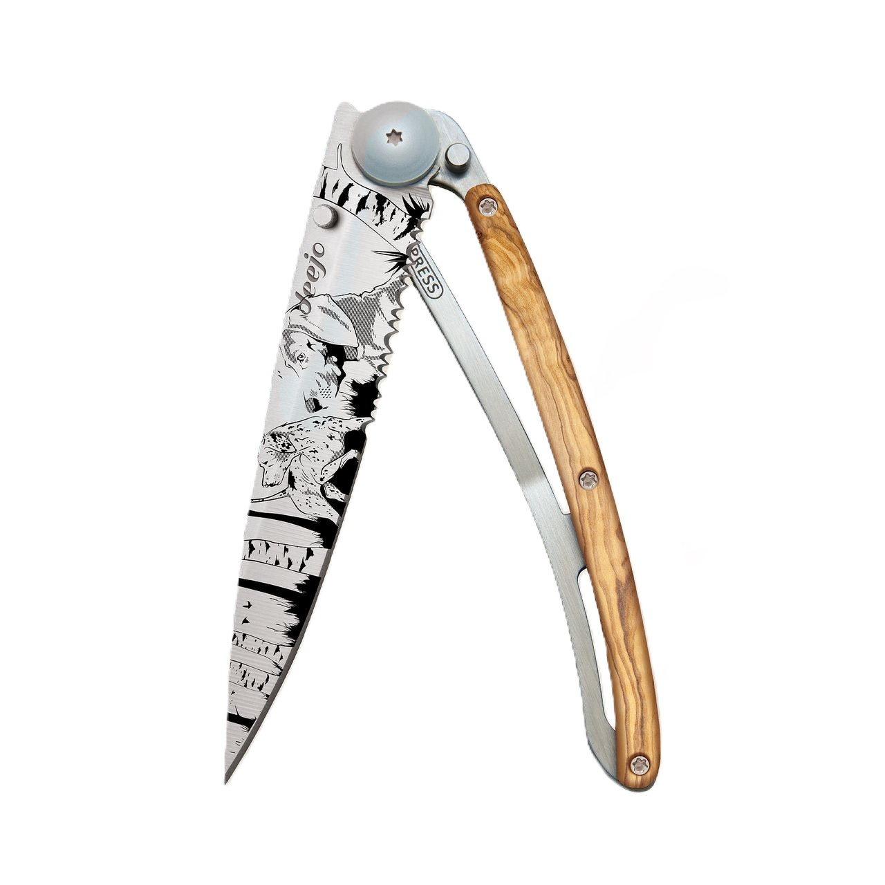 Kapesní nůž Deejo 1CB514 Tattoo Serration 37g olive wood Hunting Day