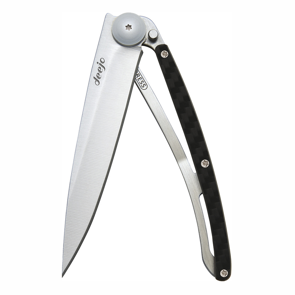 Stylový ultralehký nůž Deejo se střenkou z karbonu a čepelí s černým titanem.