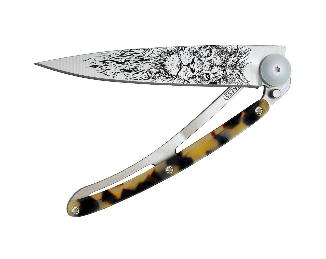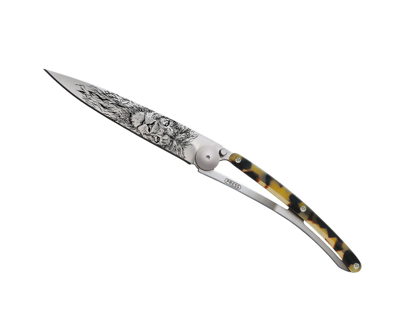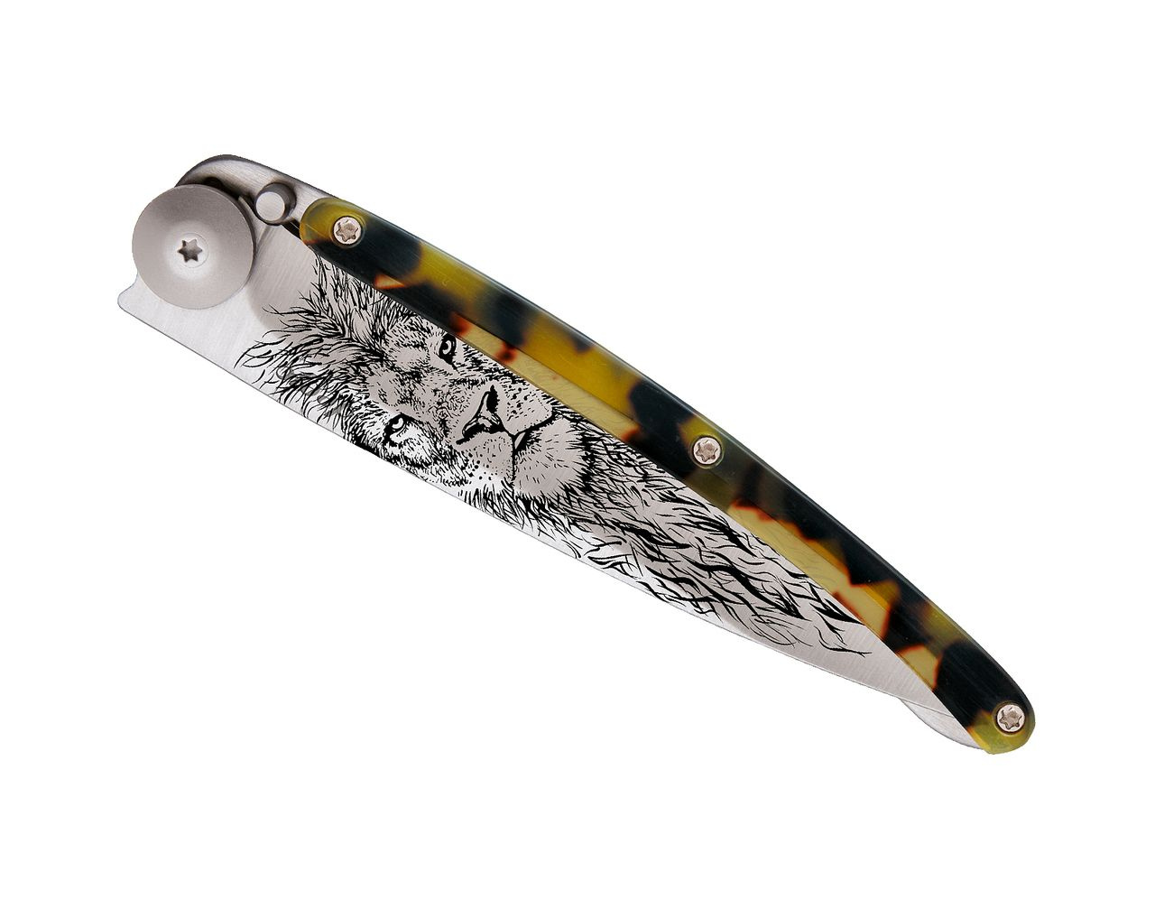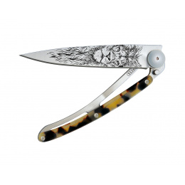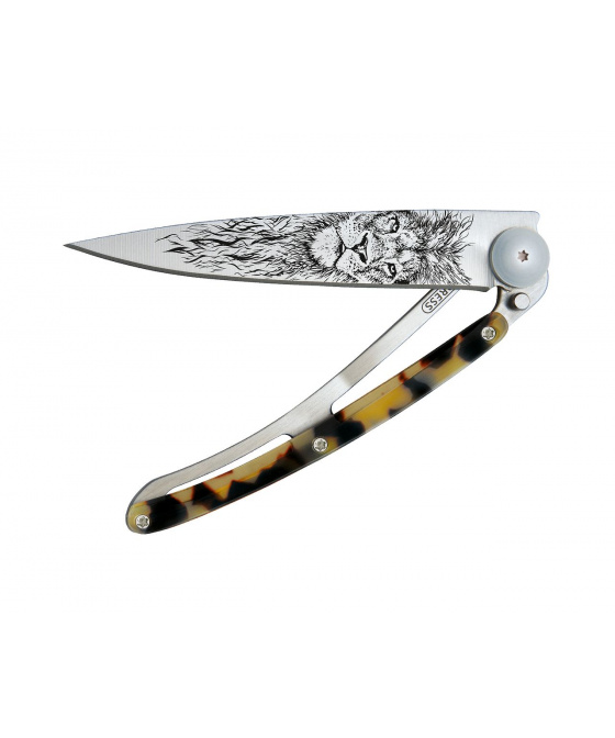 Stylový ultralehký nůž Deejo z kolekce Turtle se střenkou ze syntetické želvoviny, světle šedou matnou čepelí a tetováním lev.