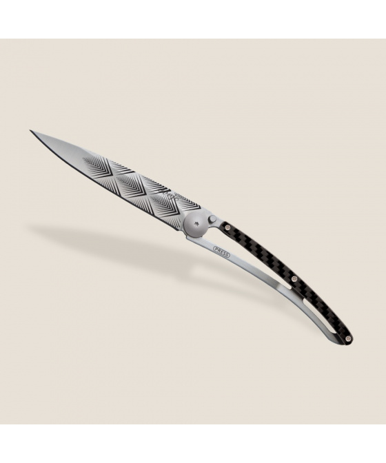 Stylový ultralehký nůž Deejo z kolekce Carbon se střenkou z uhlíkového vlákna, světle šedou matnou čepelí a tetováním "Art Déco".