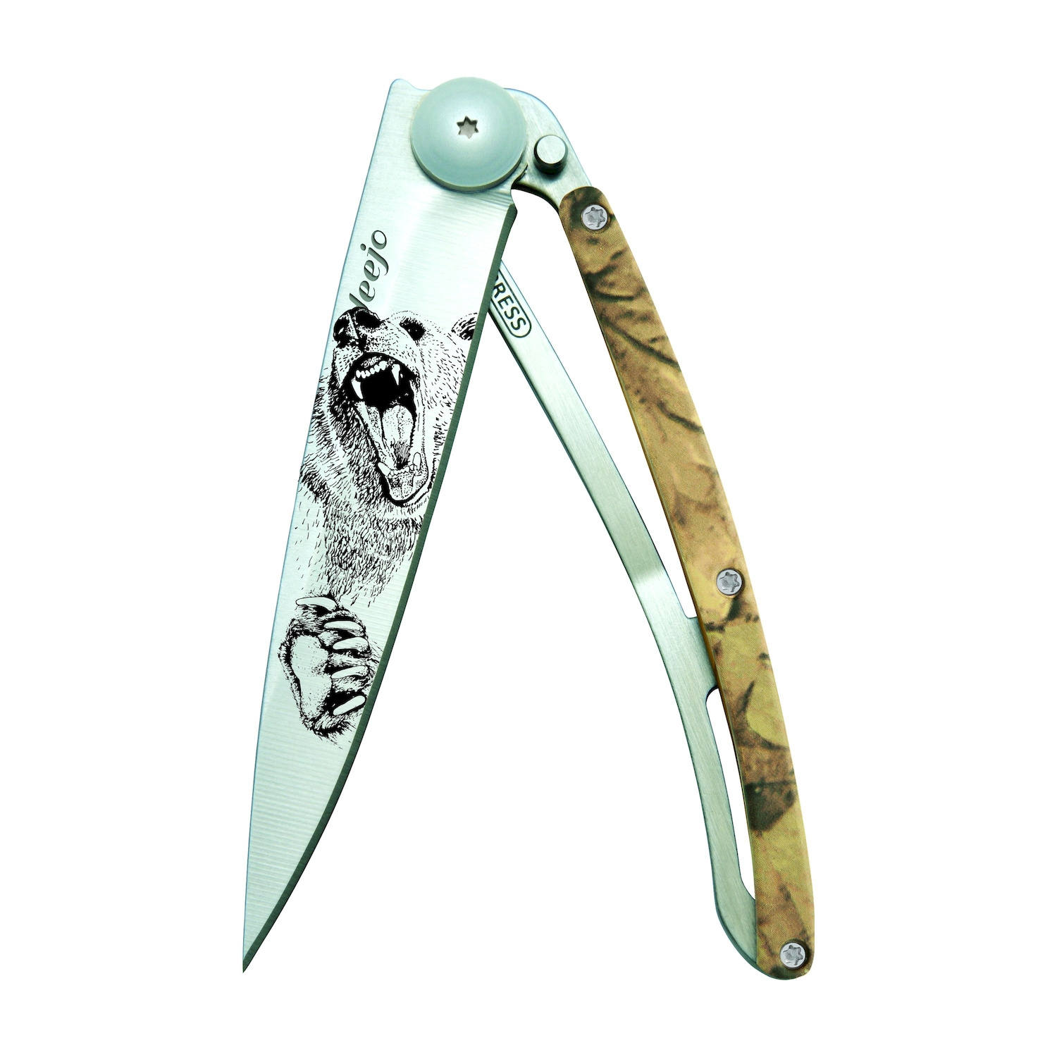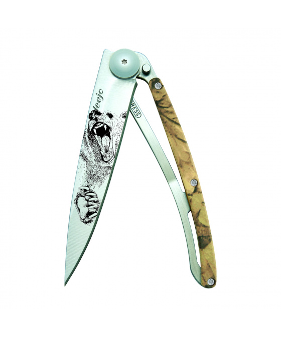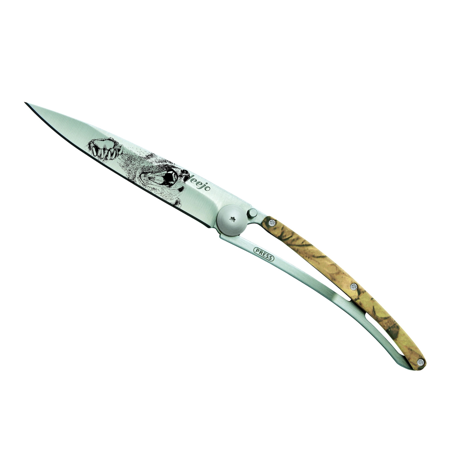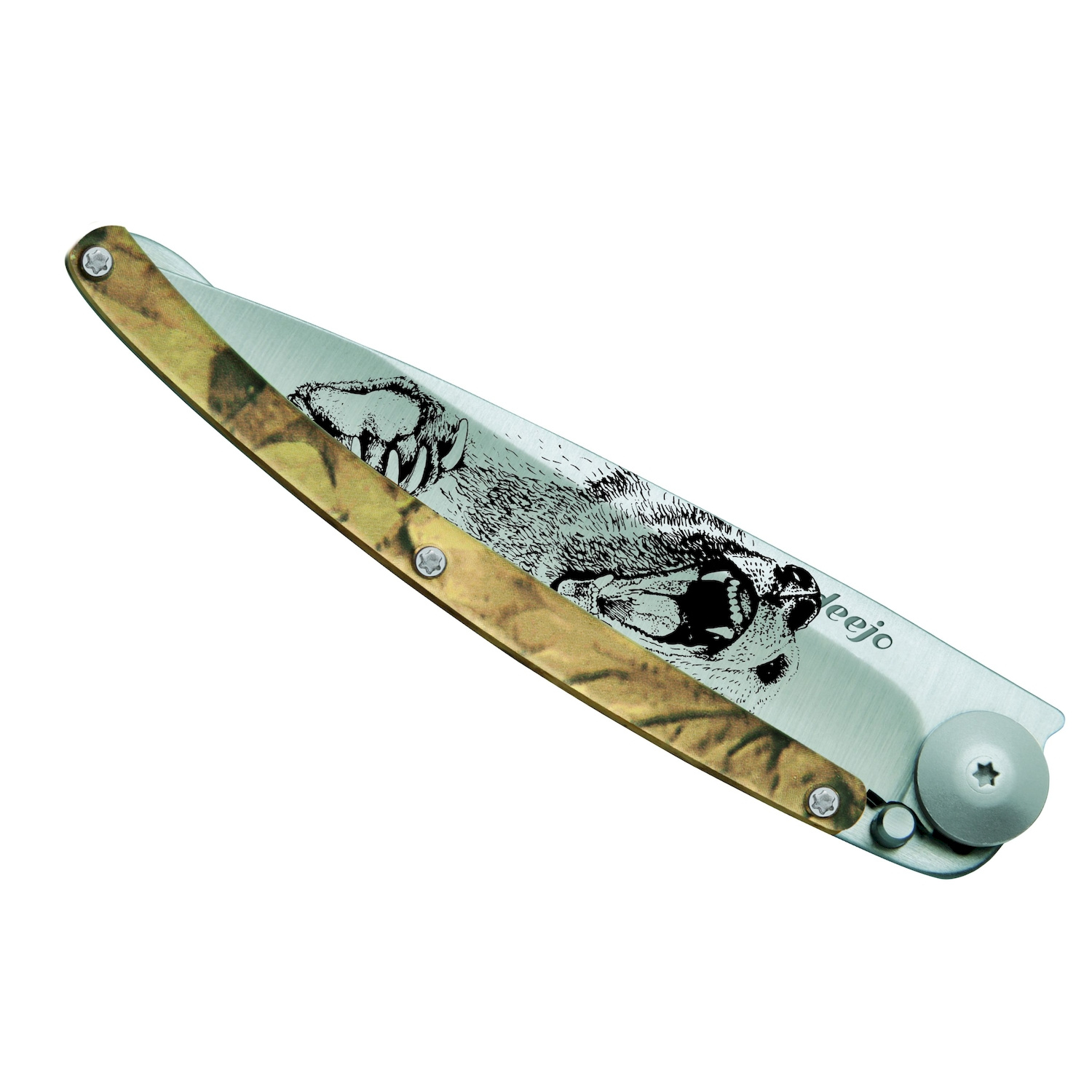 Stylový ultralehký nůž Deejo s hliníkovou střenkou s hydrografickým potiskem a světlou čepelí s tetováním "grizzly".