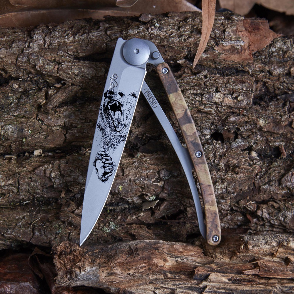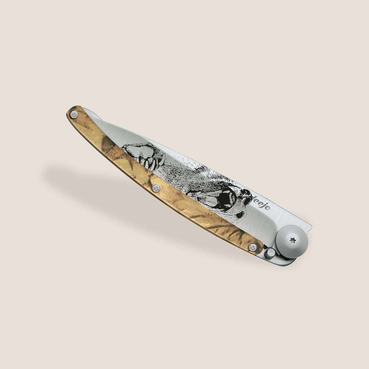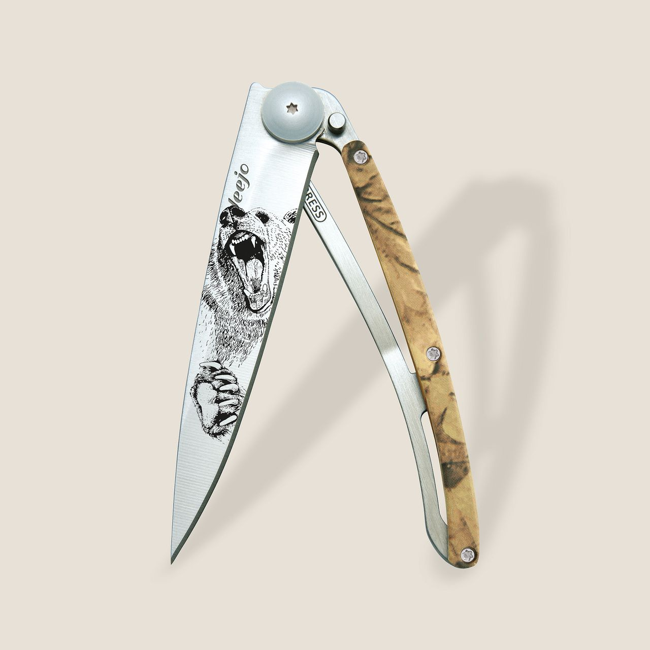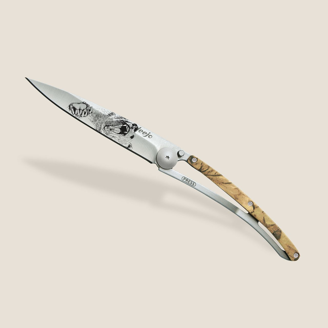 Stylový ultralehký nůž Deejo s hliníkovou střenkou s hydrografickým potiskem a světlou čepelí s tetováním "grizzly".