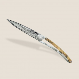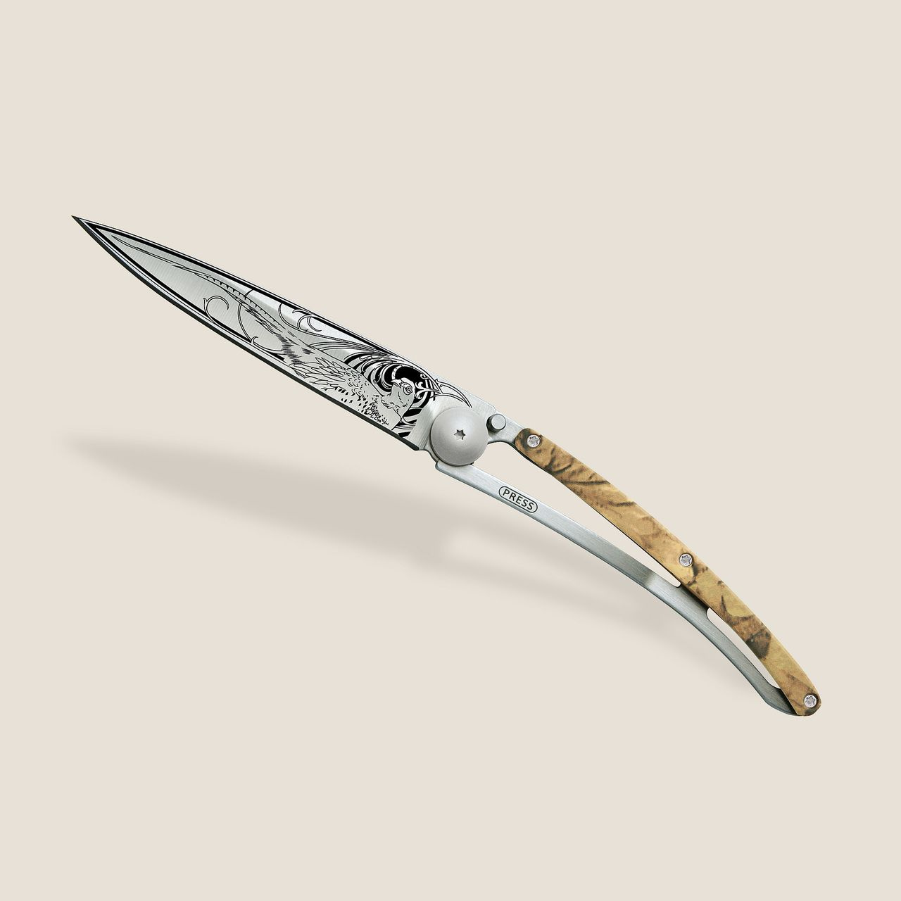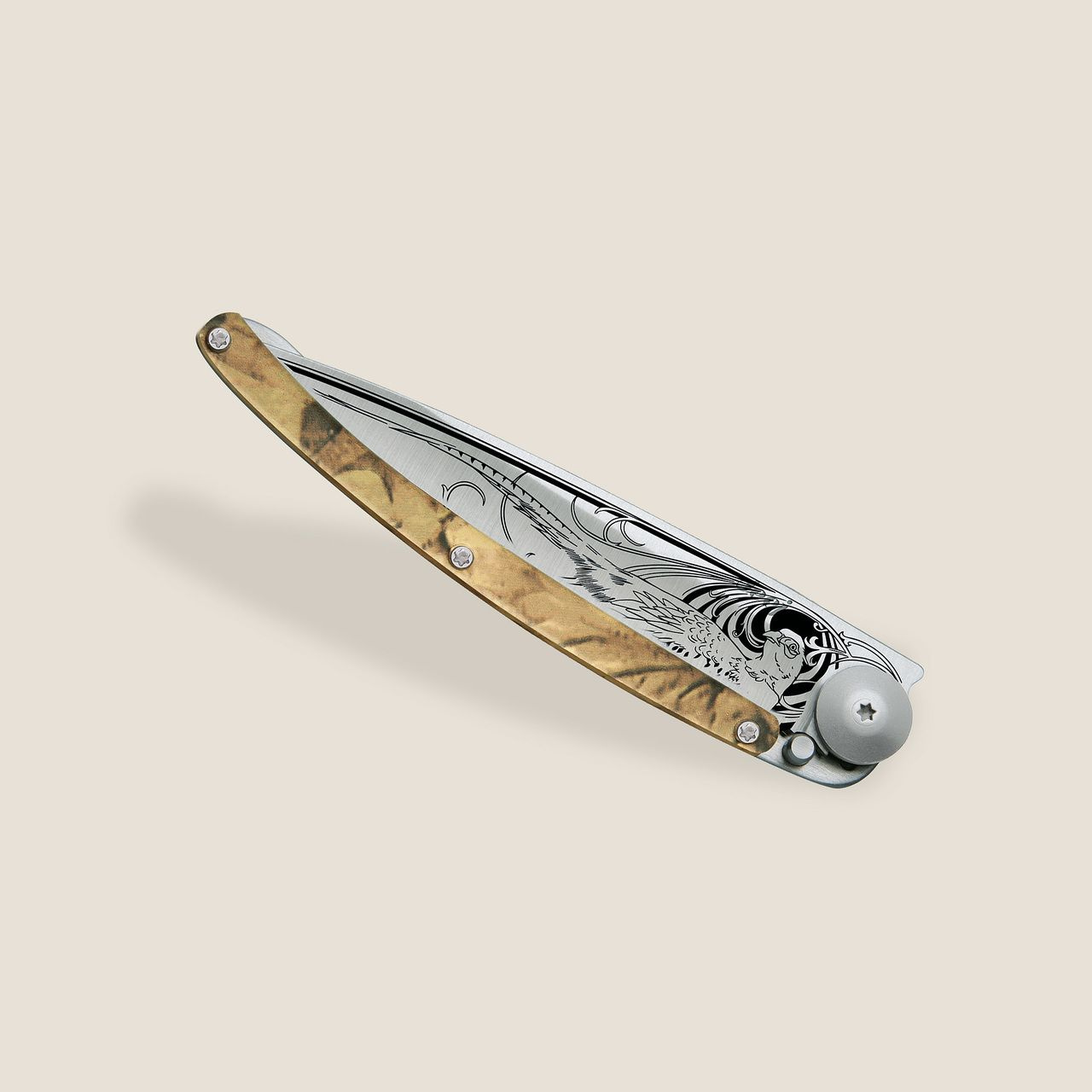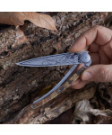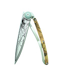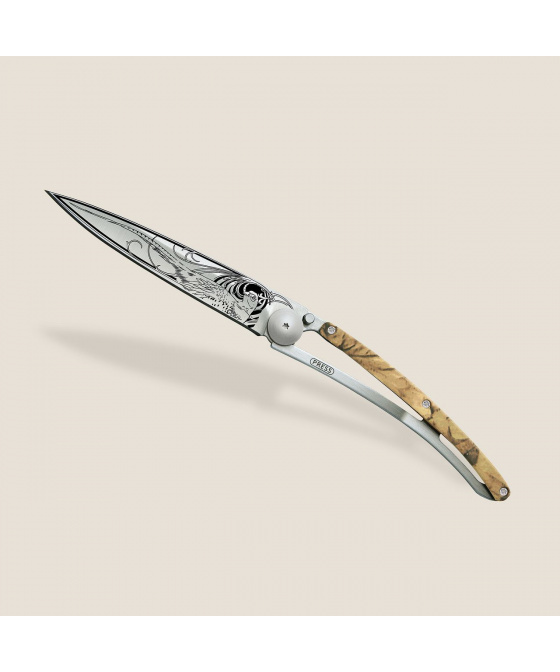 Stylový ultralehký nůž Deejo s hliníkovou střenkou s hydrografickým potiskem a světlou čepelí s tetováním "bažant".