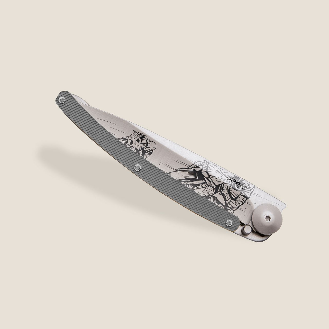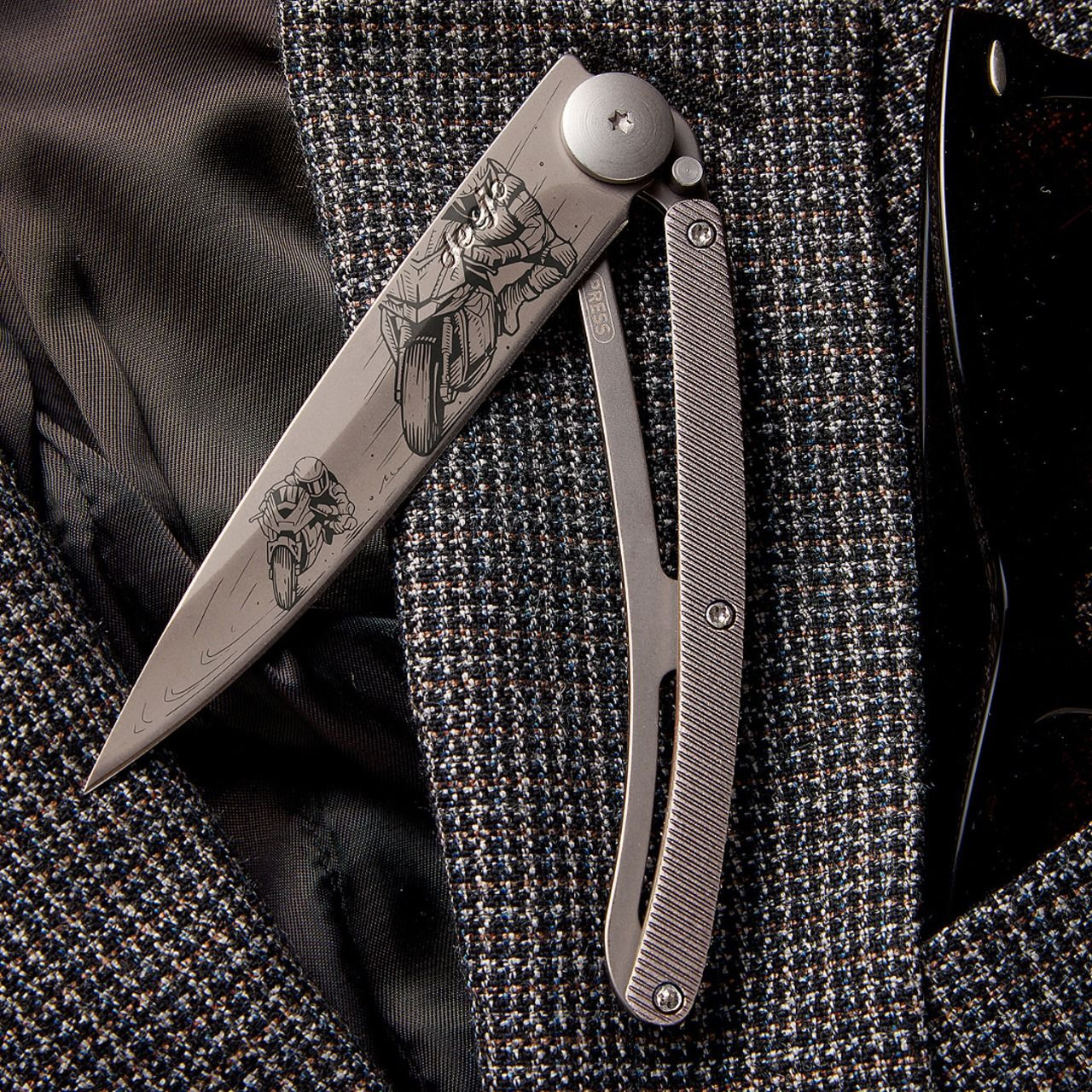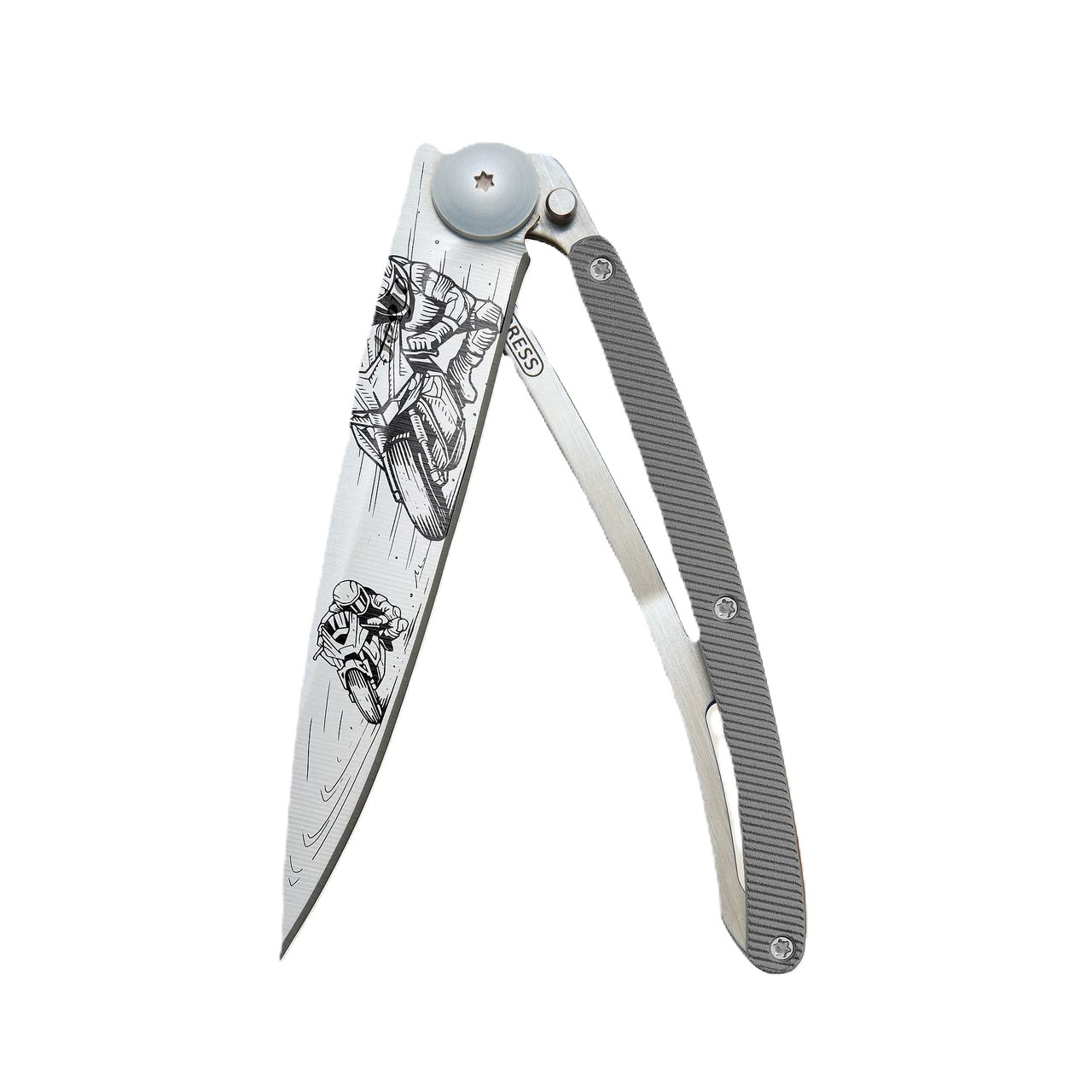 Stylový ultralehký nůž Deejo se střenkou z hliníku a motivem Moto racing.