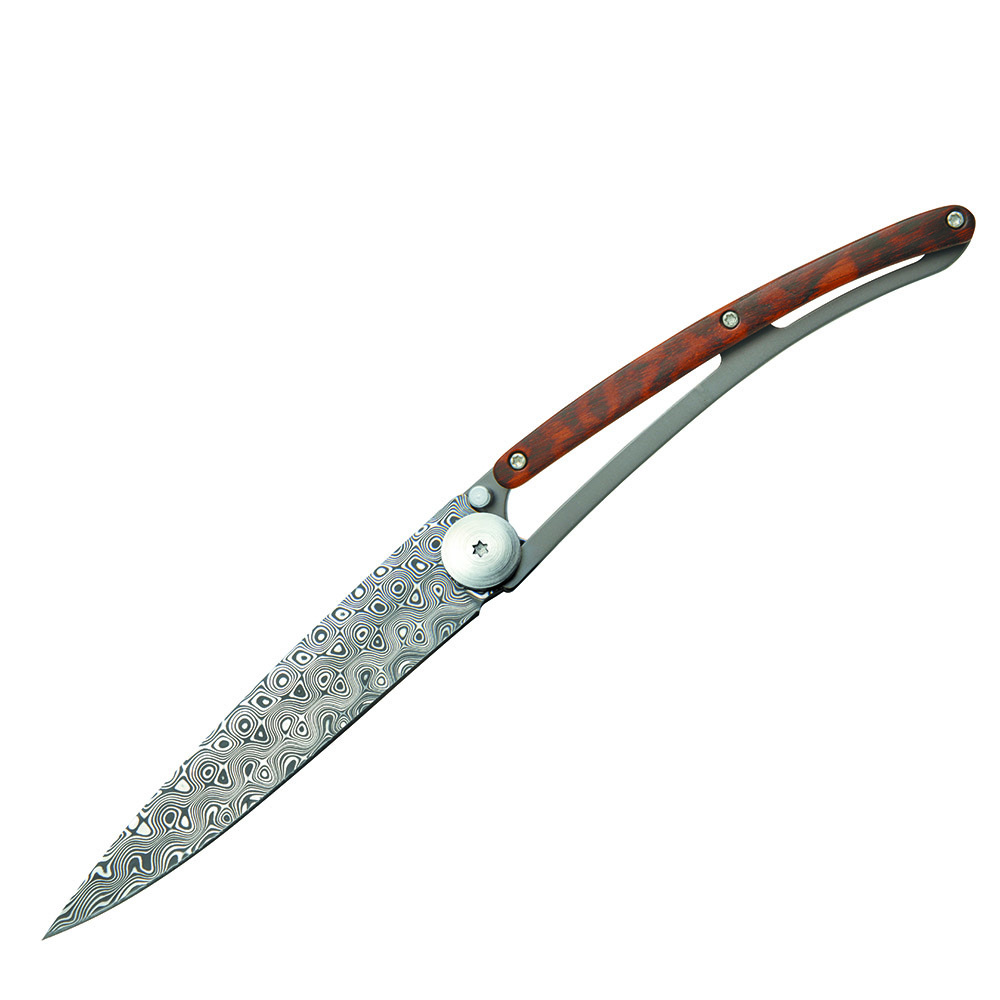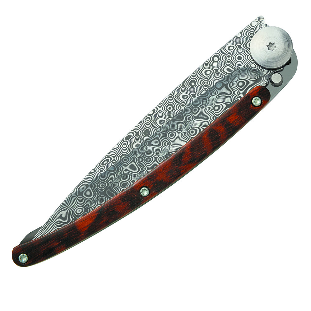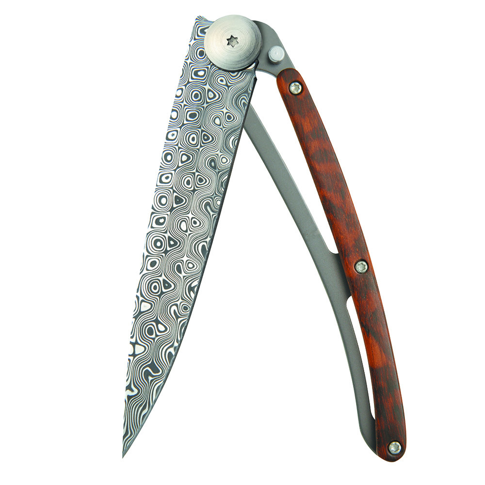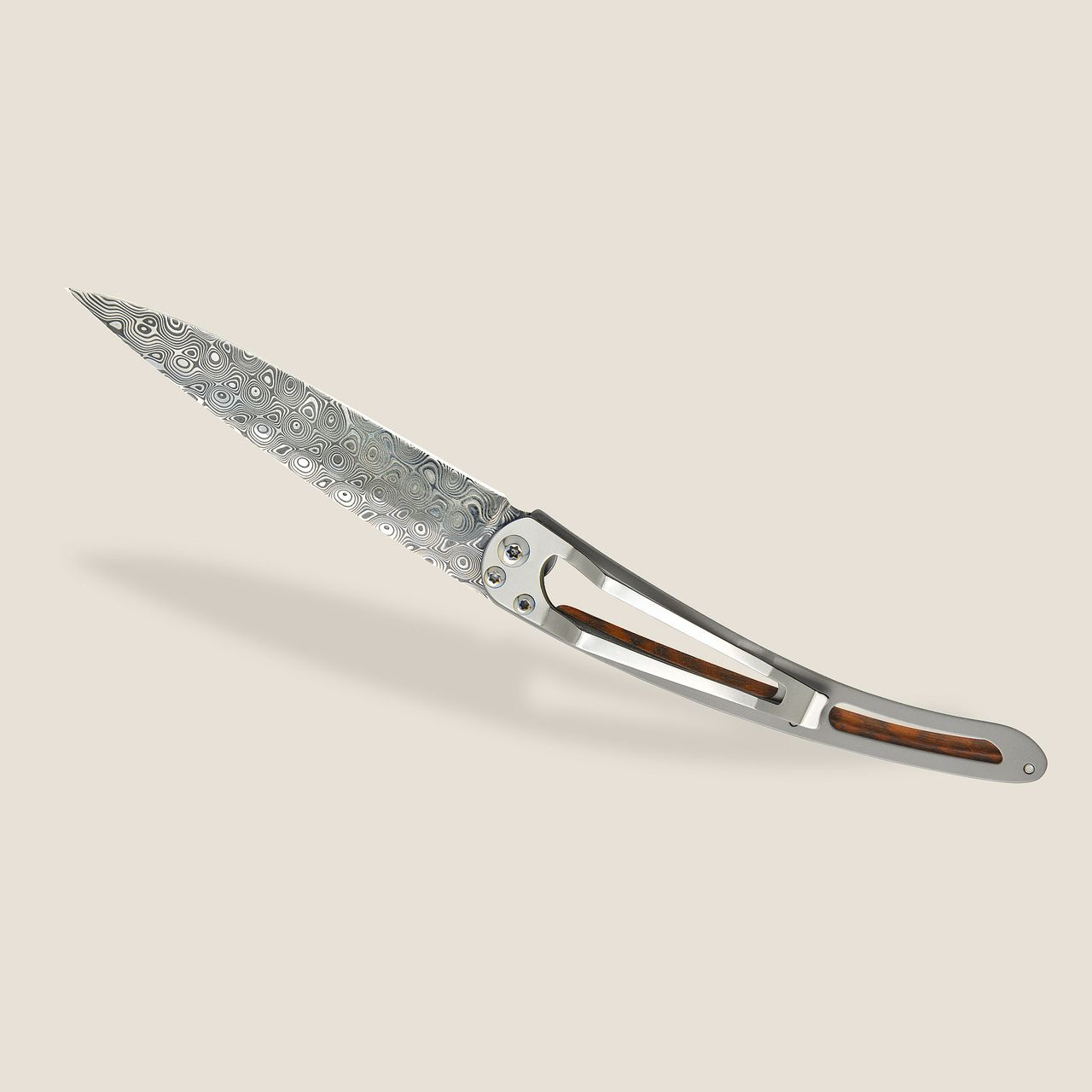 Exkluzivní verze Deejo s čepelí z damaškové ocele dává vyniknout spojení moderního designu a tradičního materiálu.