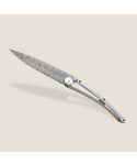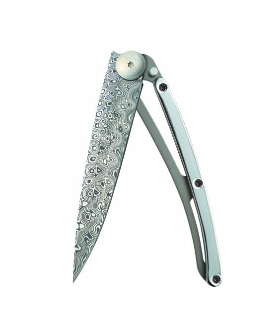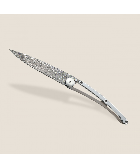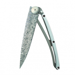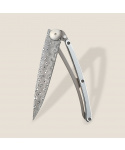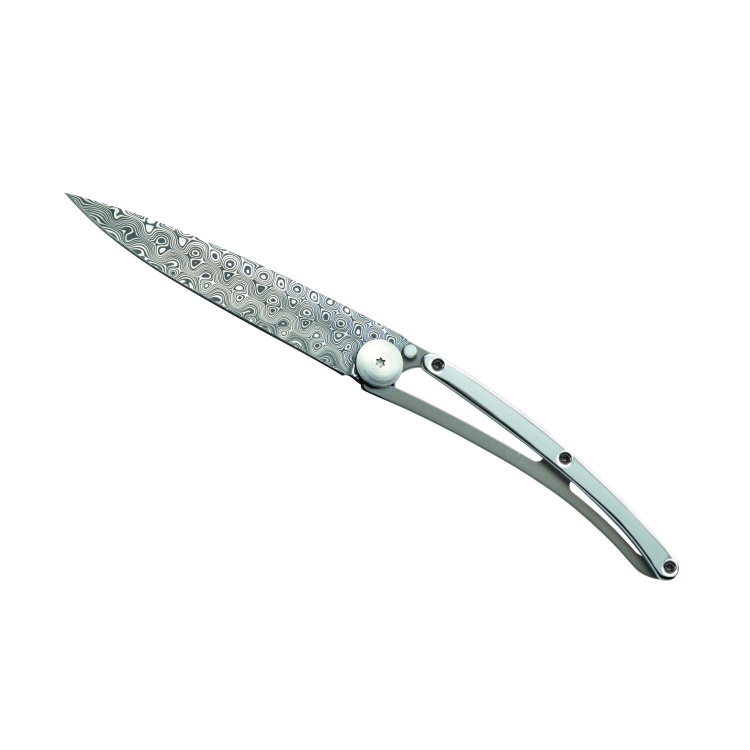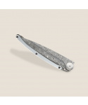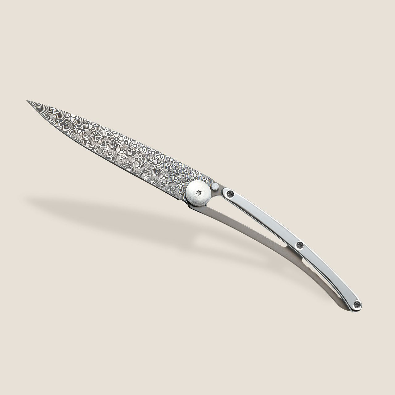 Exkluzivní verze Deejo s čepelí z damaškové ocele vzoru Damasteel Rose a střenkou s bílým pozlacením.