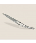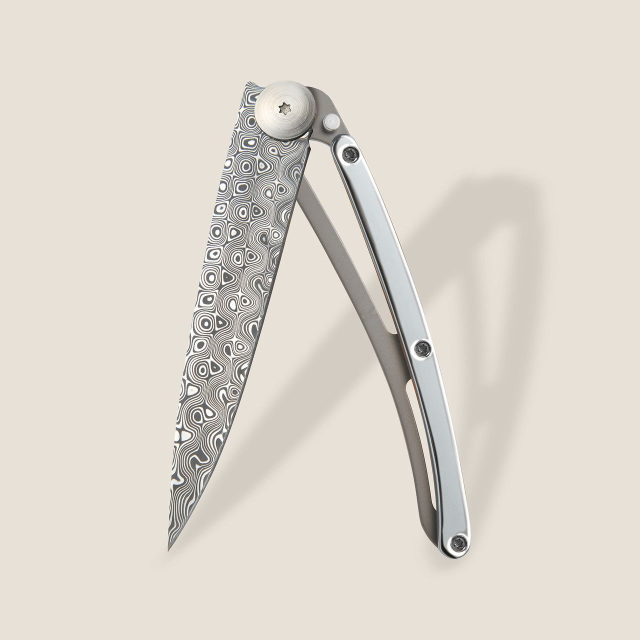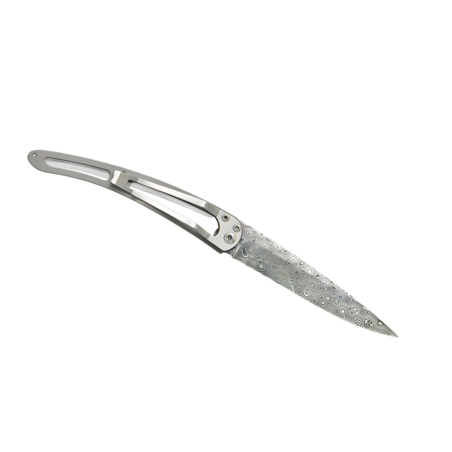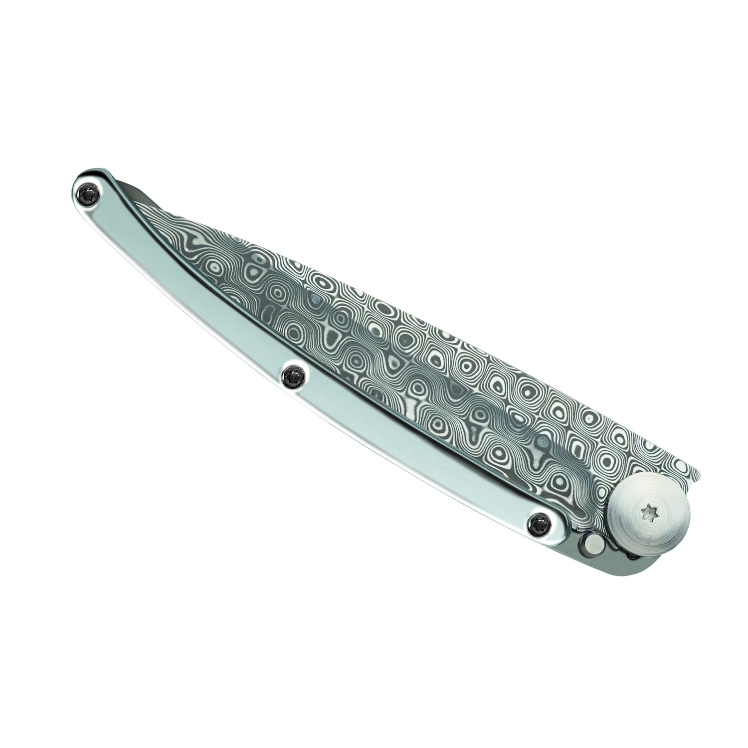 Exkluzivní verze Deejo s čepelí z damaškové ocele vzoru Damasteel Rose a střenkou s bílým pozlacením.
