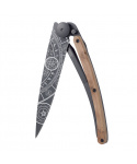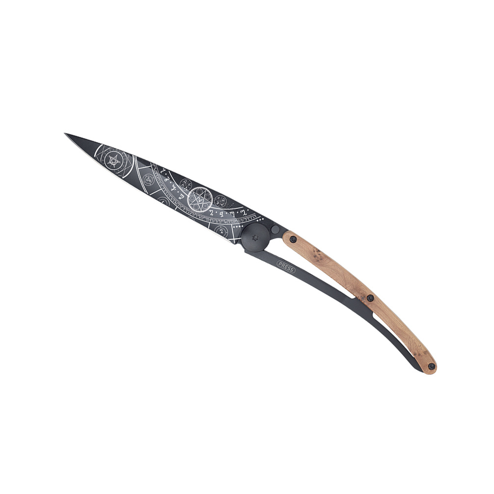 Stylový ultralehký nůž Deejo se střenkou z kořene exotického jalovce a tetováním "Esoteric".