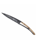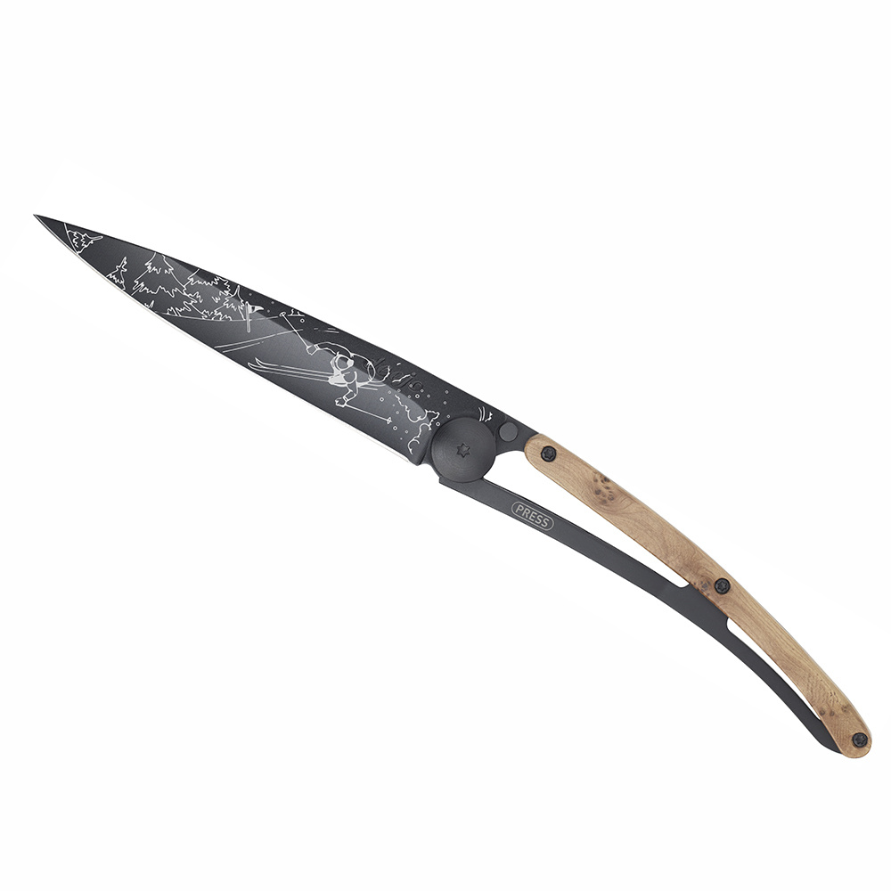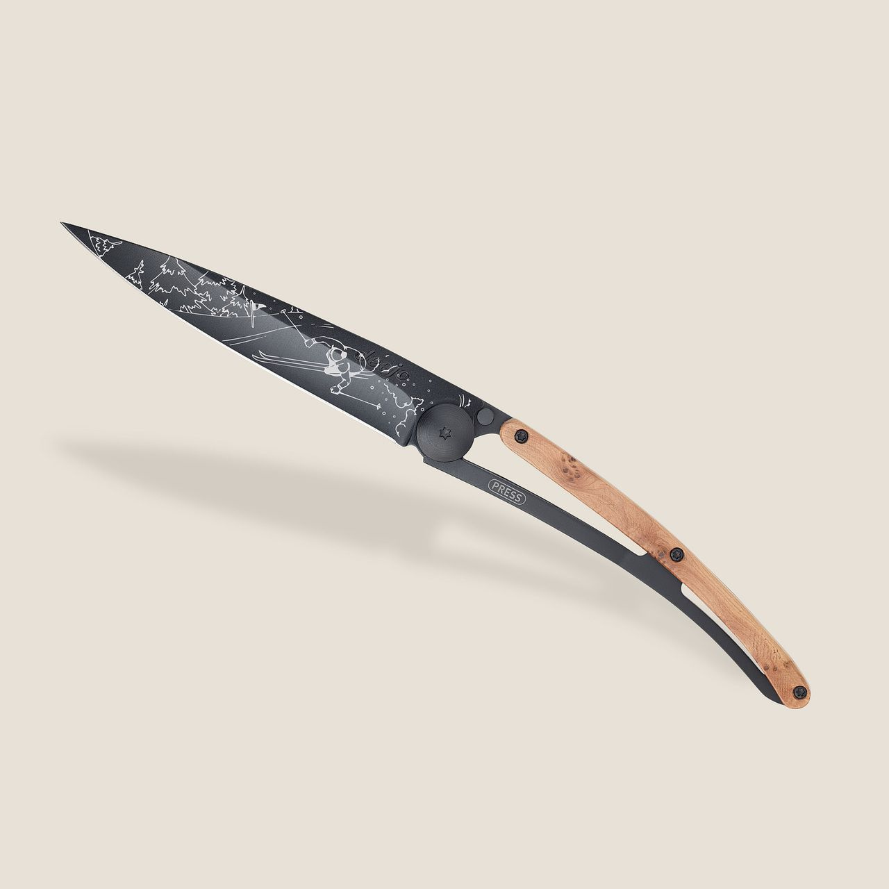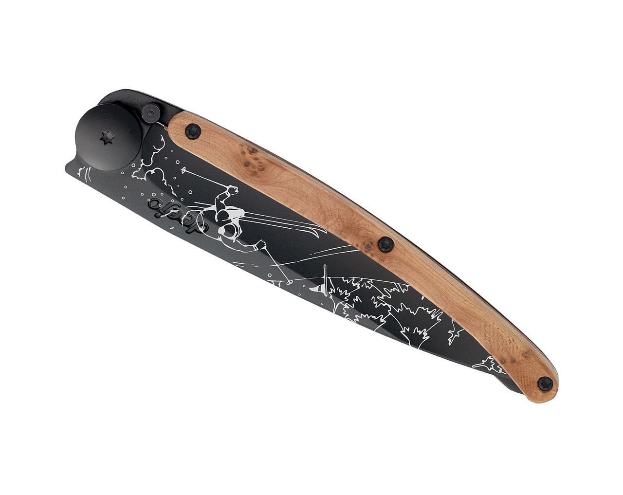Stylový ultralehký nůž Deejo se střenkou z kořene exotického jalovce a tetováním "lyže".