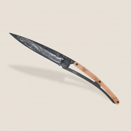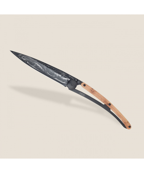 Stylový ultralehký nůž Deejo se střenkou z kořene exotického jalovce a tetováním "vlny".