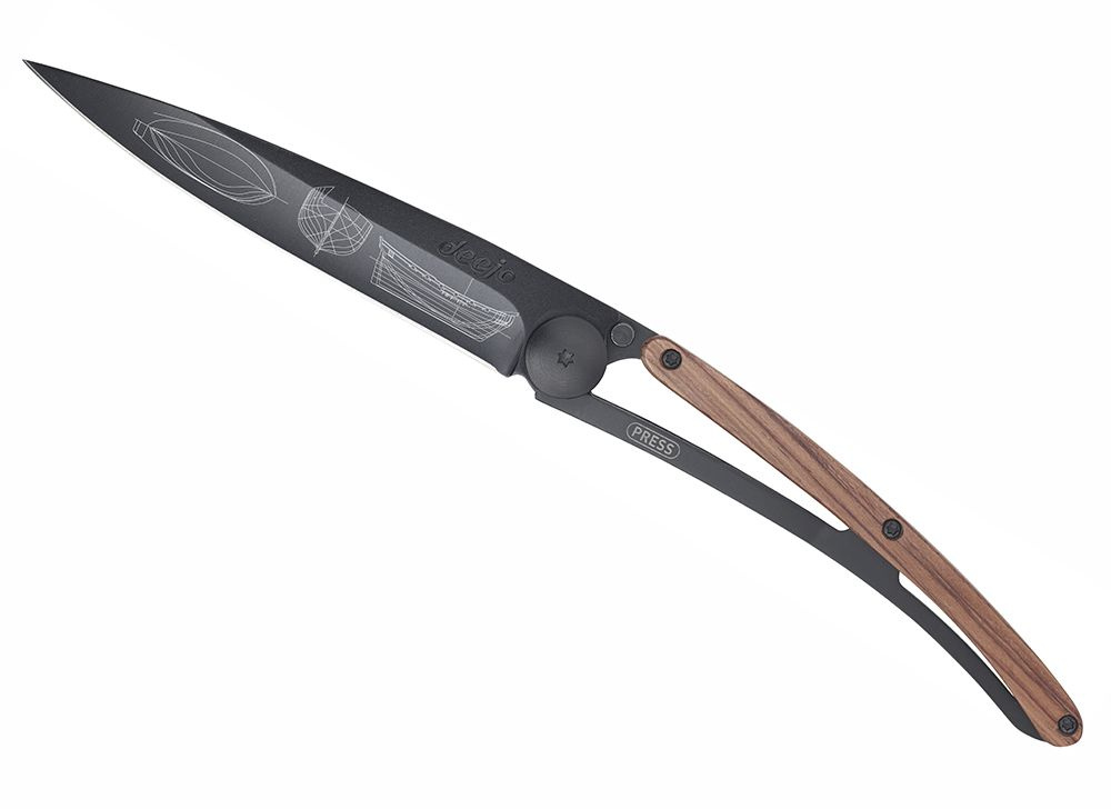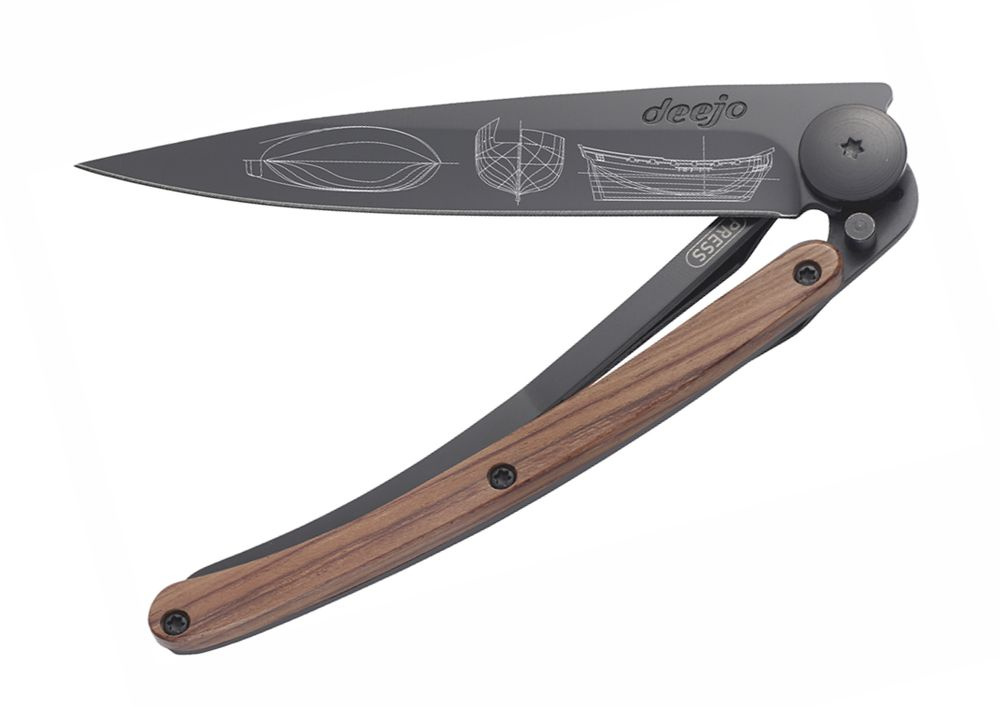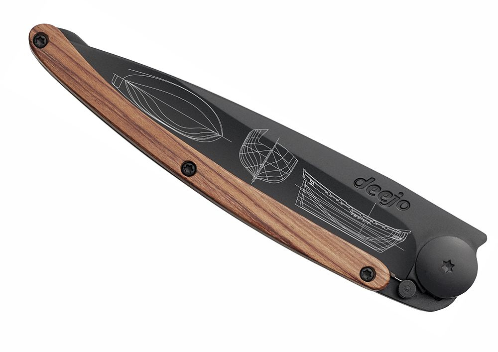 Stylový ultralehký nůž Deejo se střenkou z dřeviny coralwood a tetováním "galéra".