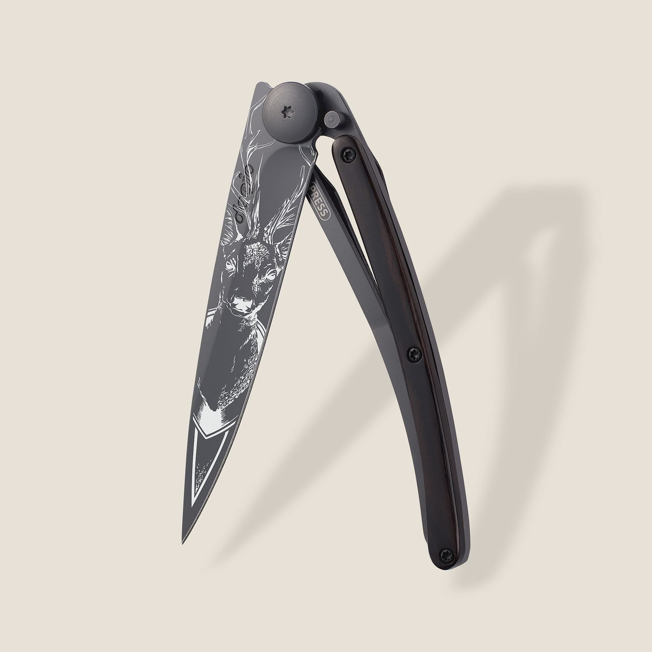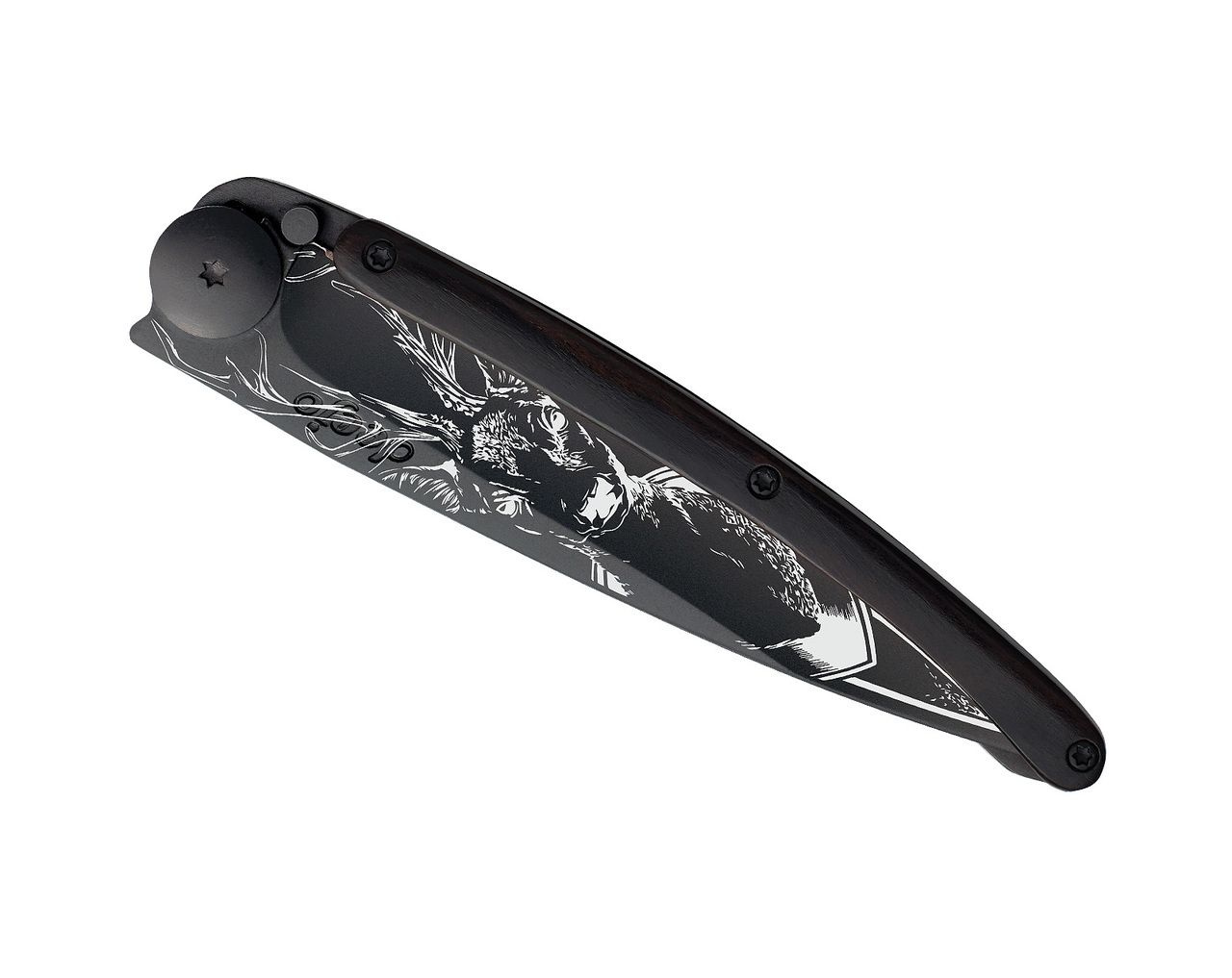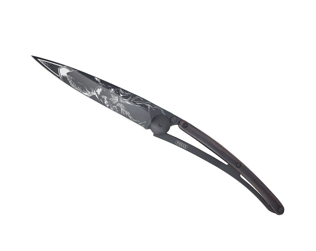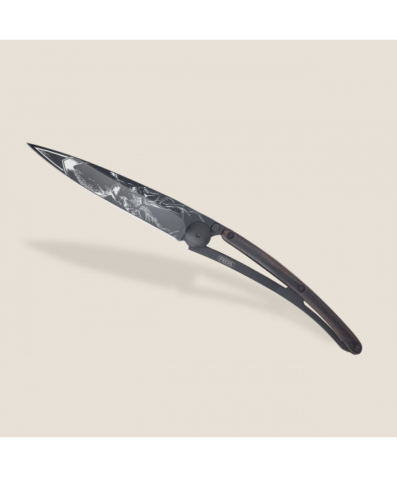 Stylový ultralehký nůž Deejo se střenkou z ebenového dřeva a tetováním "jelen".