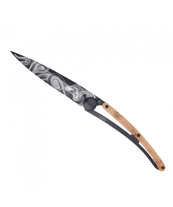 Stylový ultralehký nůž Deejo se střenkou z kořene exotického jalovce a tetováním "had".
