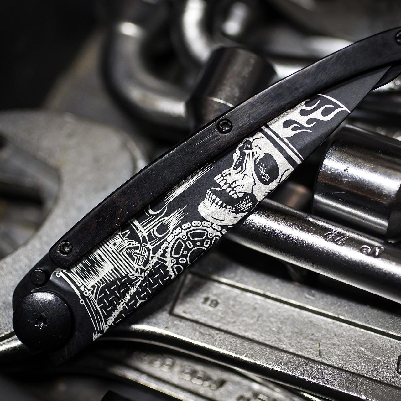 Stylový ultralehký nůž Deejo se střenkou z ebenového dřeva a motivem "ride or die".
