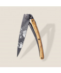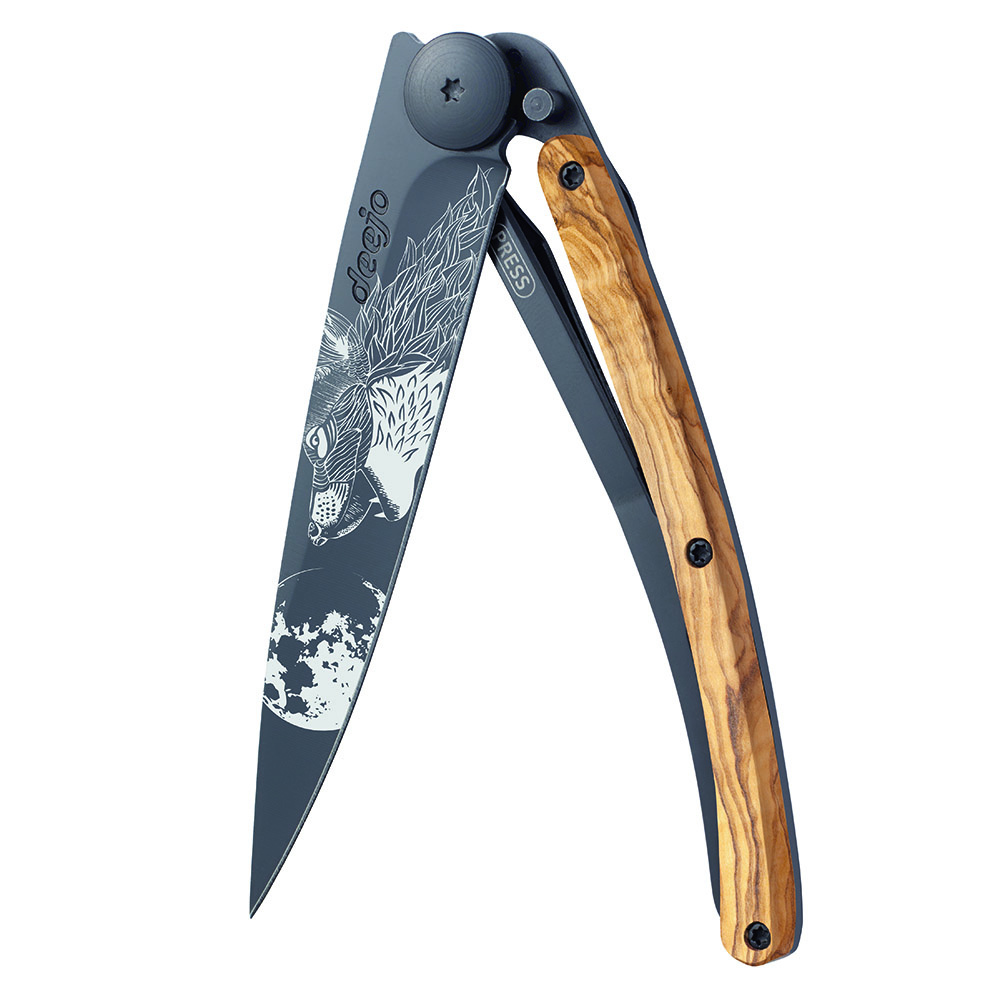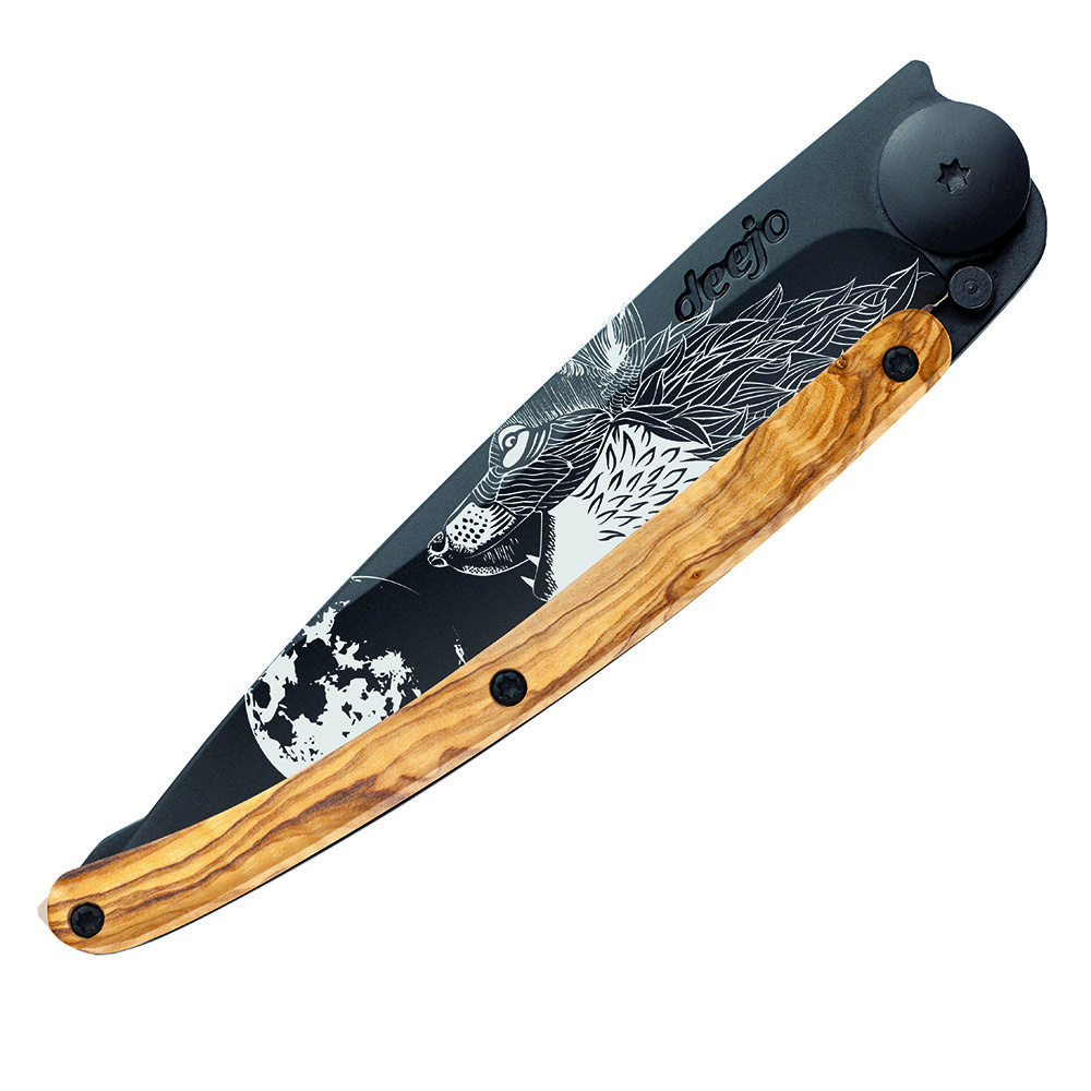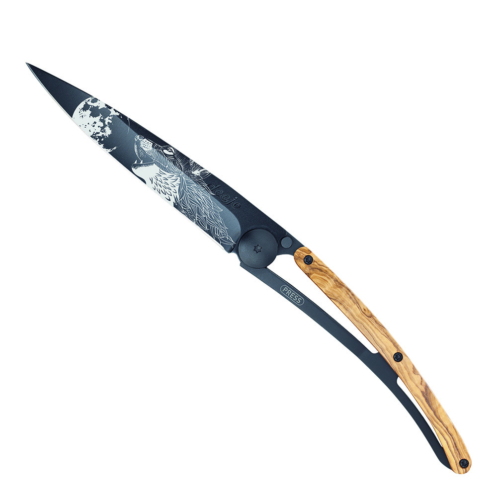Stylový ultralehký nůž Deejo se střenkou z olivového dřeva a motivem "vyjící vlk".Více