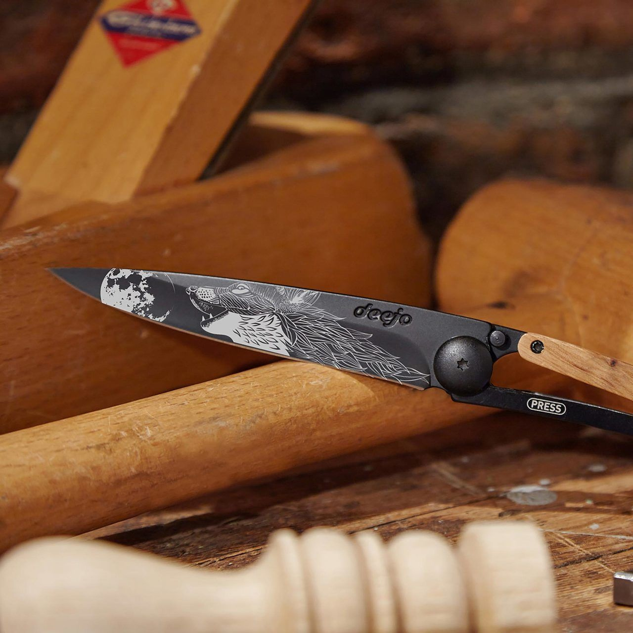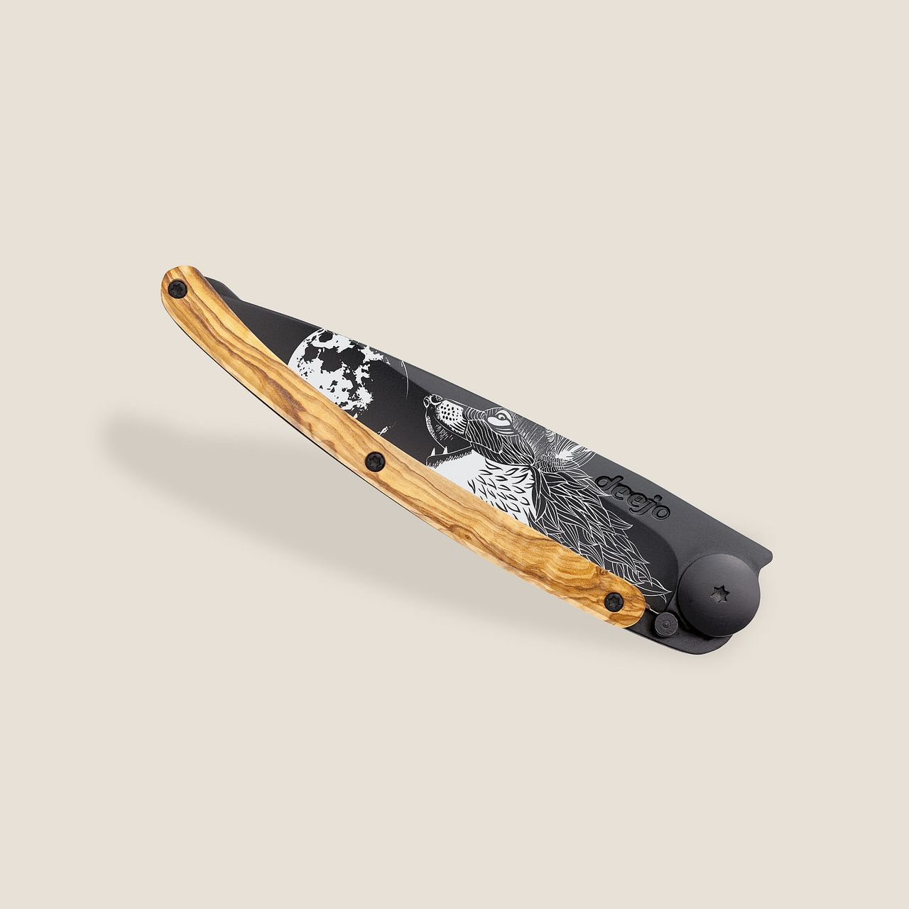 Stylový ultralehký nůž Deejo se střenkou z olivového dřeva a motivem "vyjící vlk".