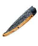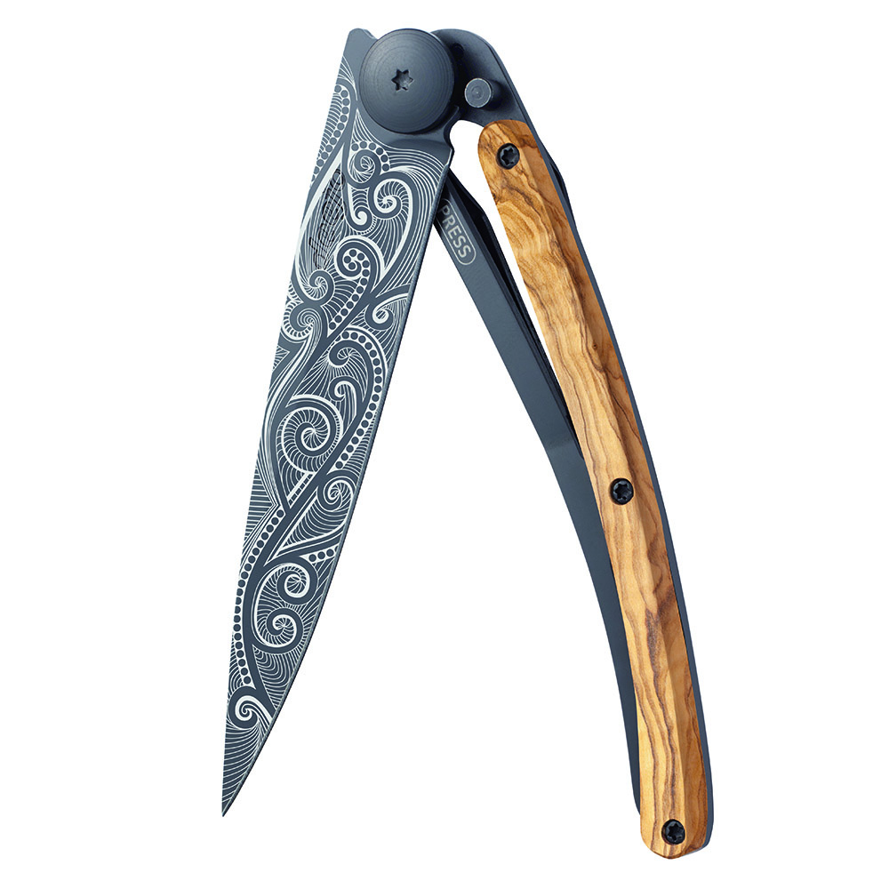 Stylový ultralehký nůž Deejo se střenkou z olivového dřeva a motivem "pacifik".