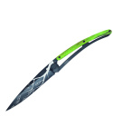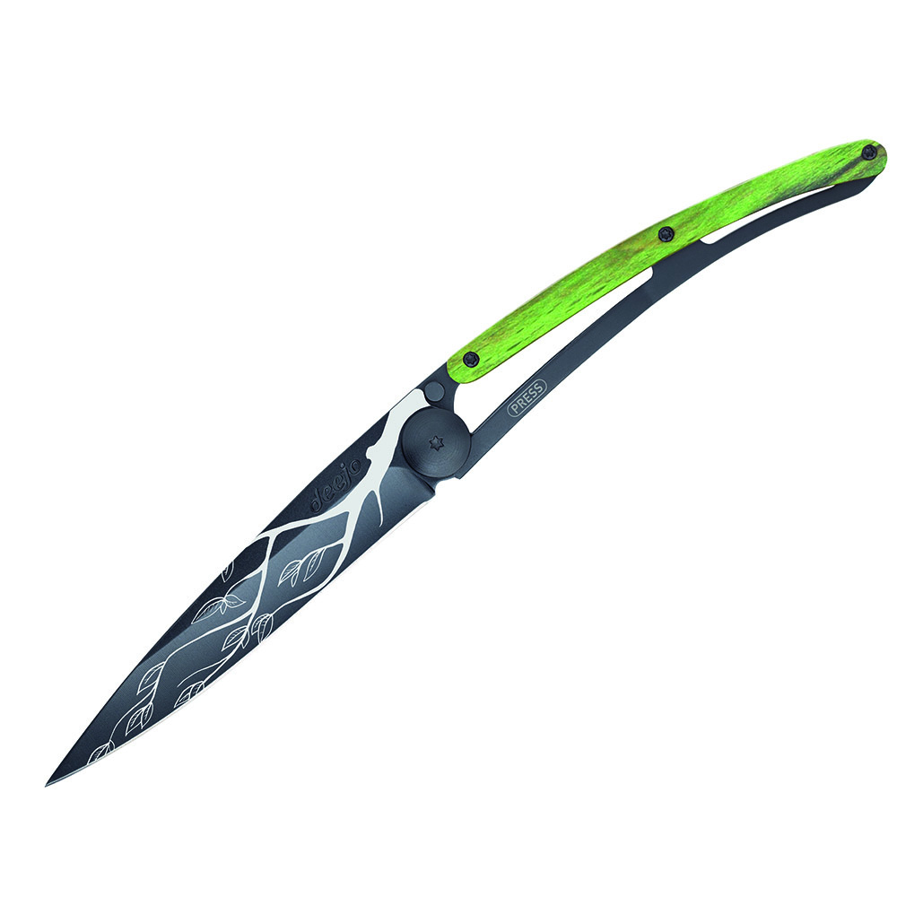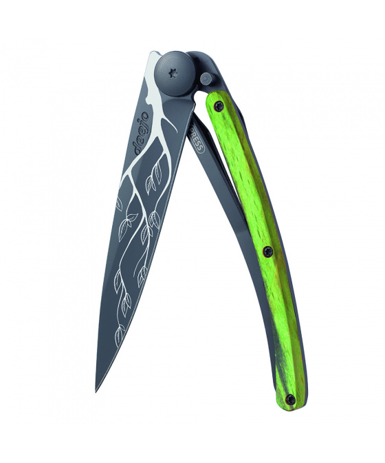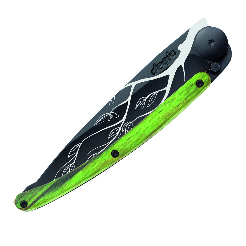 Stylový ultralehký nůž Deejo se střenkou ze zeleně mořeného bukového dřeva a motivem "strom".