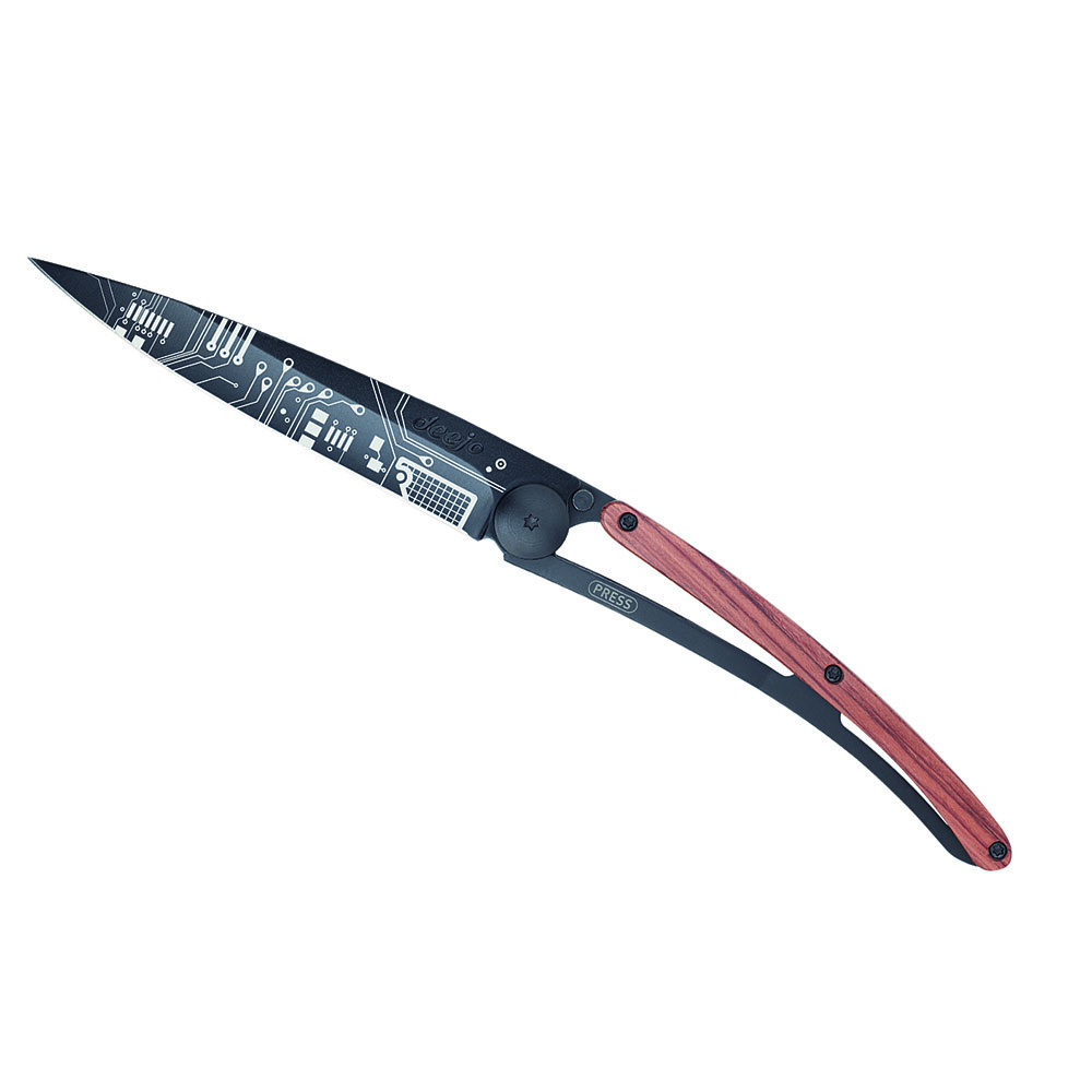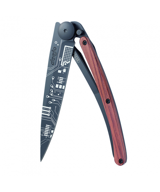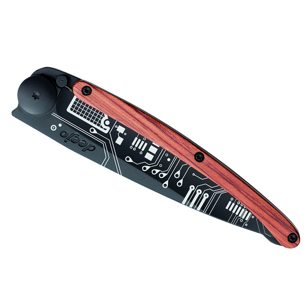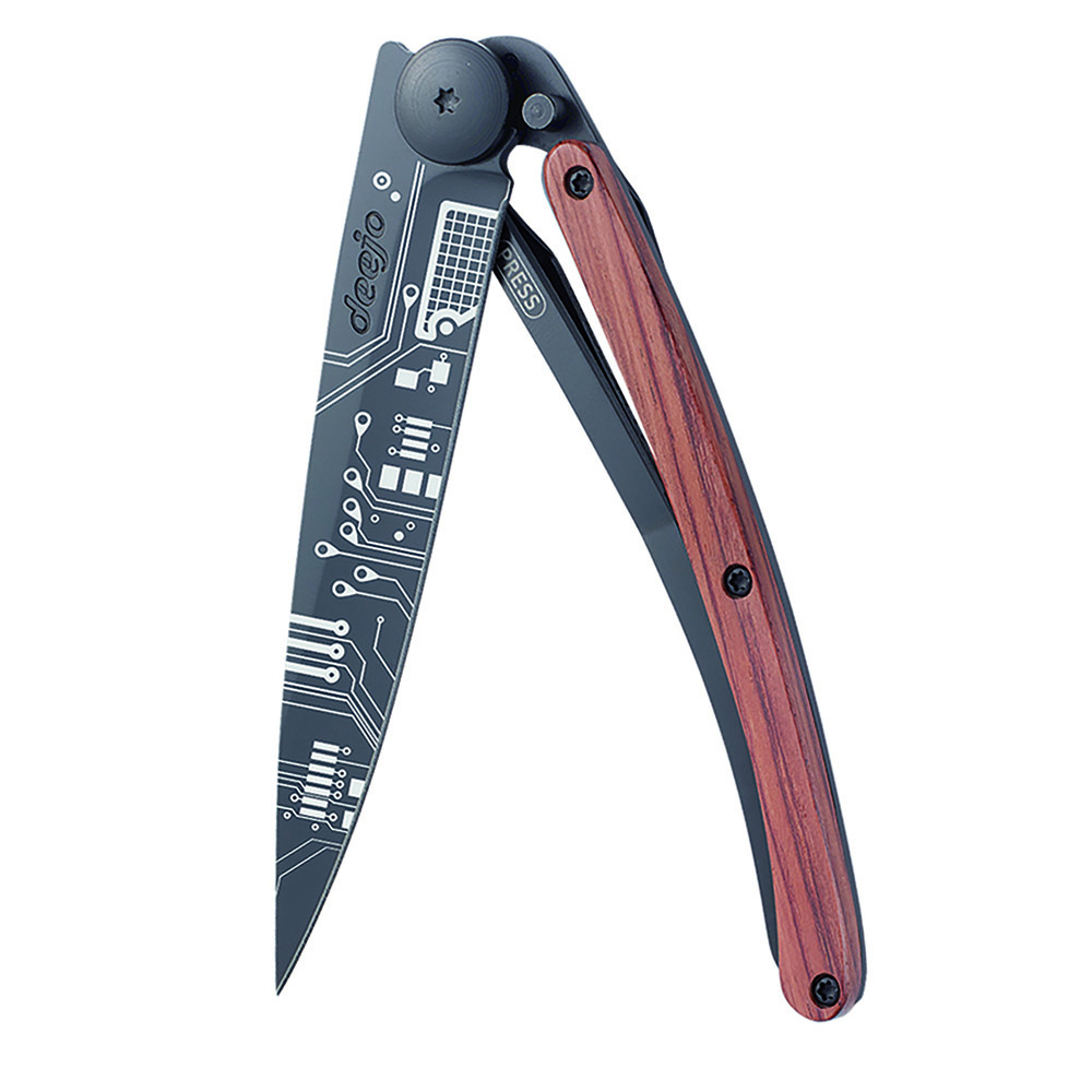 Stylový ultralehký nůž Deejo se střenkou z přírodního dřeva coralwood a tetováním "Circuit Board".