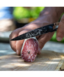 Stylový ultralehký nůž Deejo se střenkou z olivového dřeva a motivem čuníka před zabíjačkou.