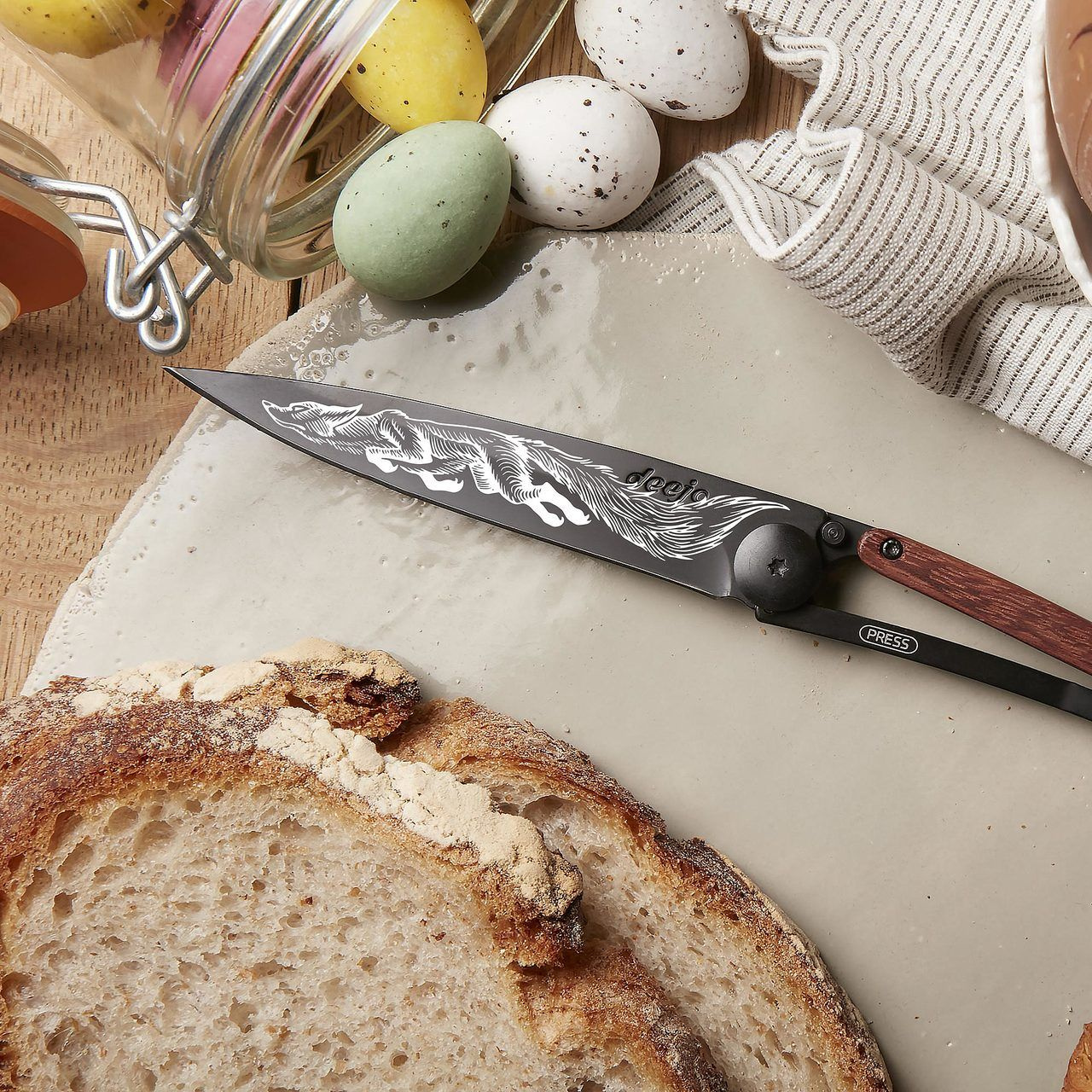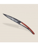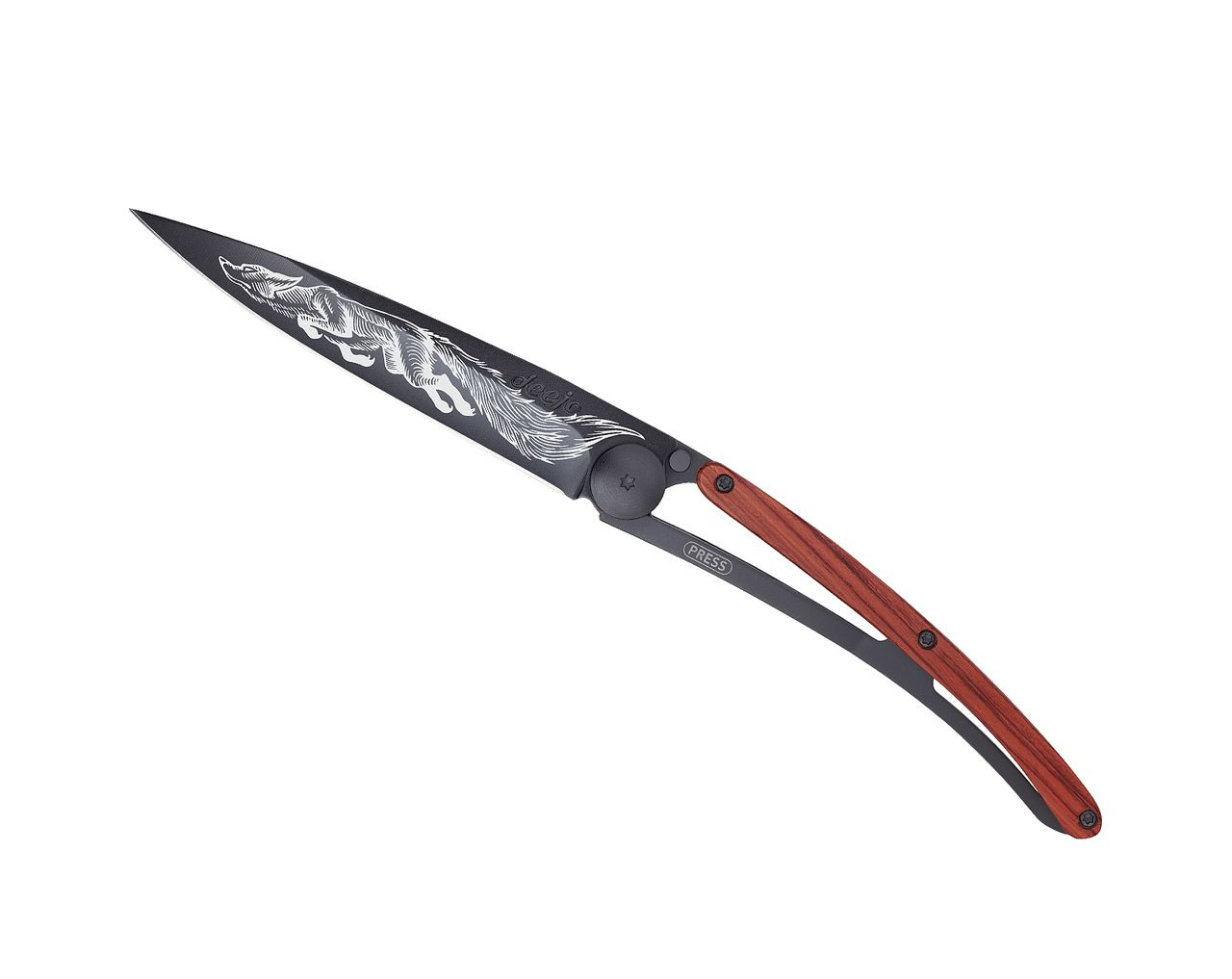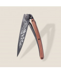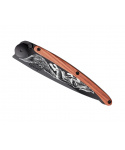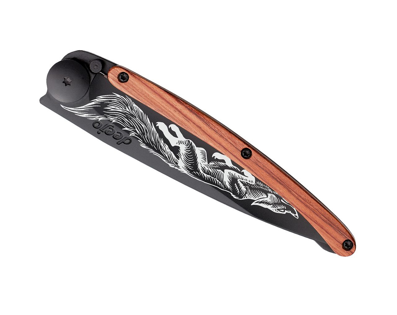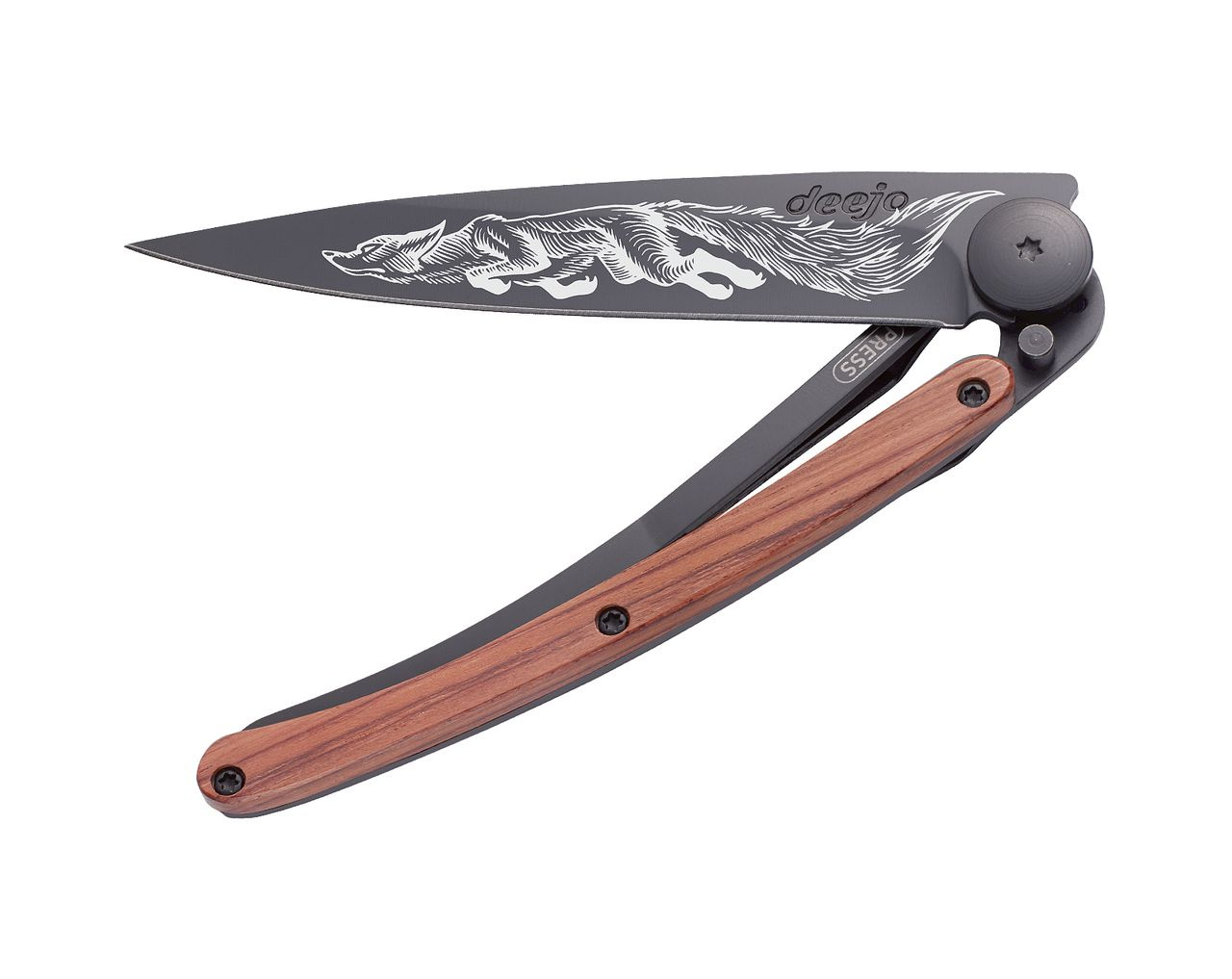 Stylový ultralehký nůž Deejo se střenkou z dřeva coralwood a motivem přikrčené lišky.