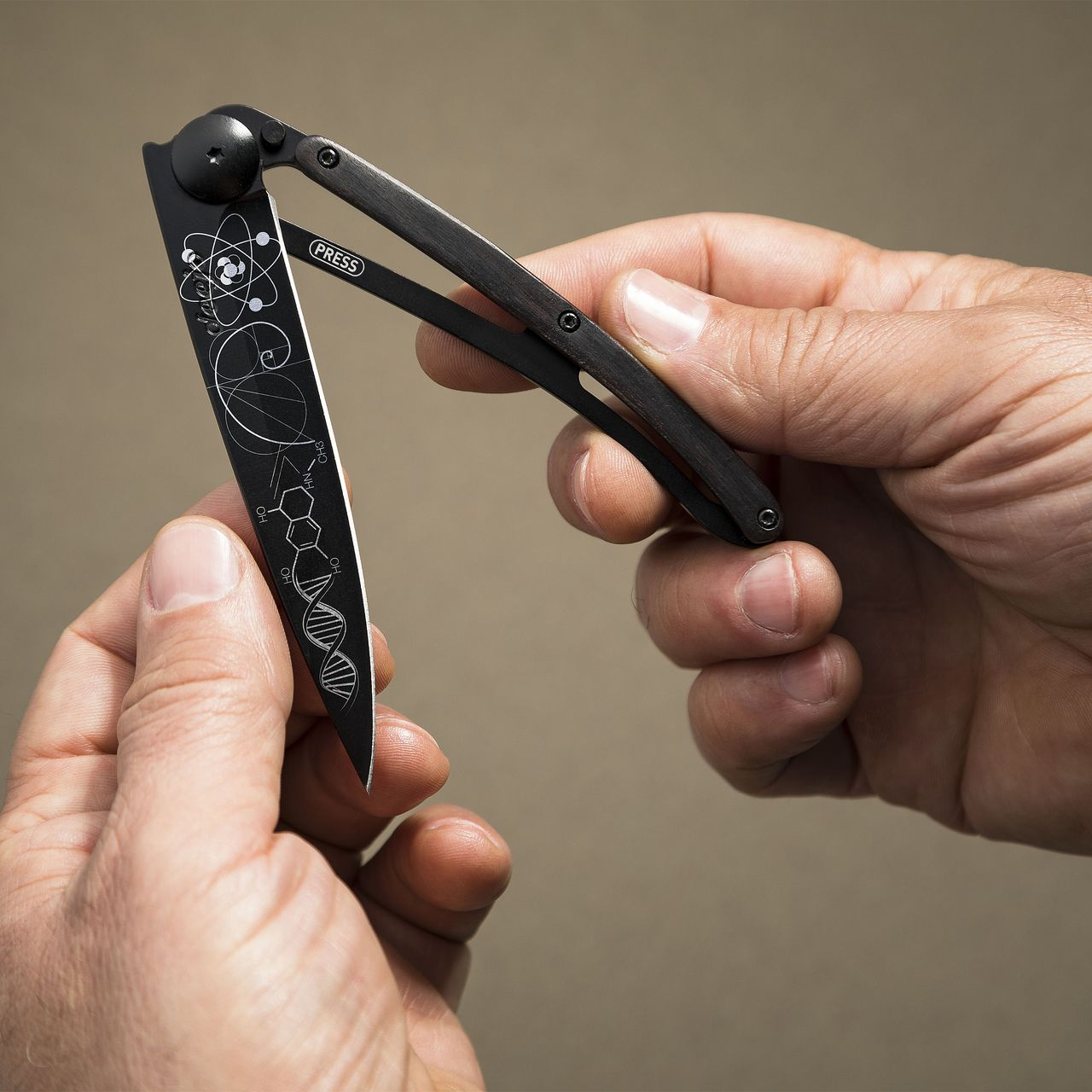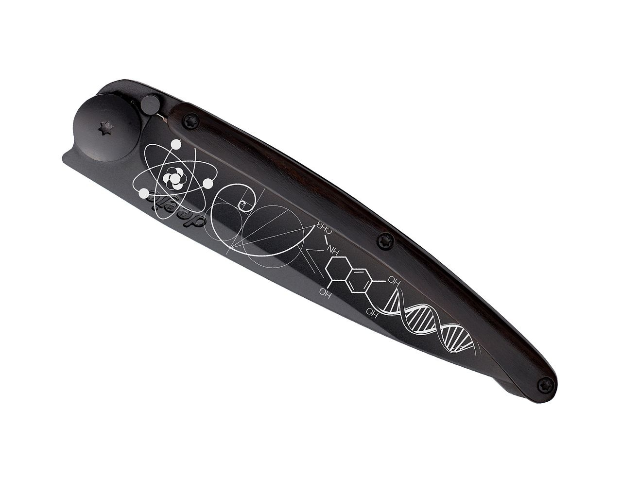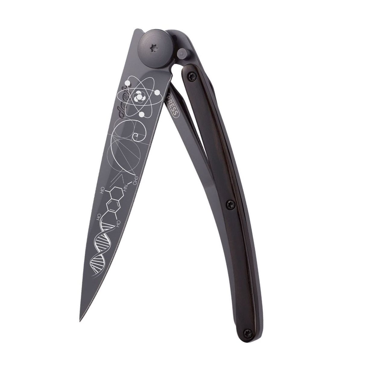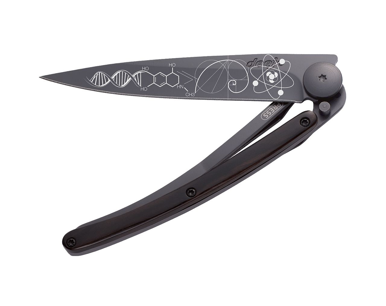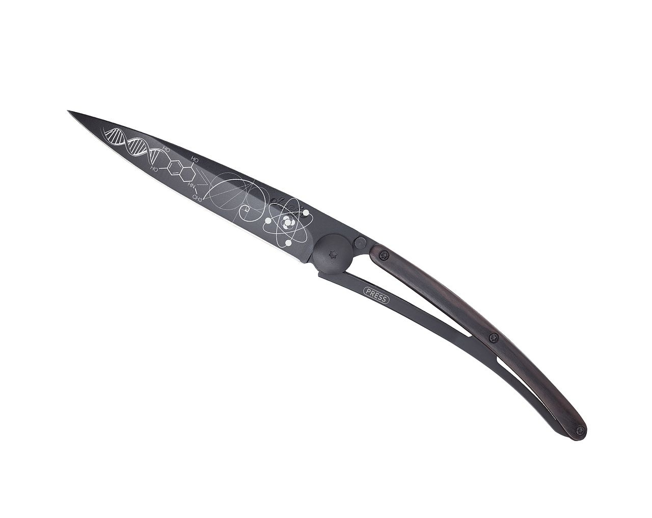 Stylový ultralehký nůž Deejo se střenkou z ebenového dřeva a motivy z oblasti vědy.