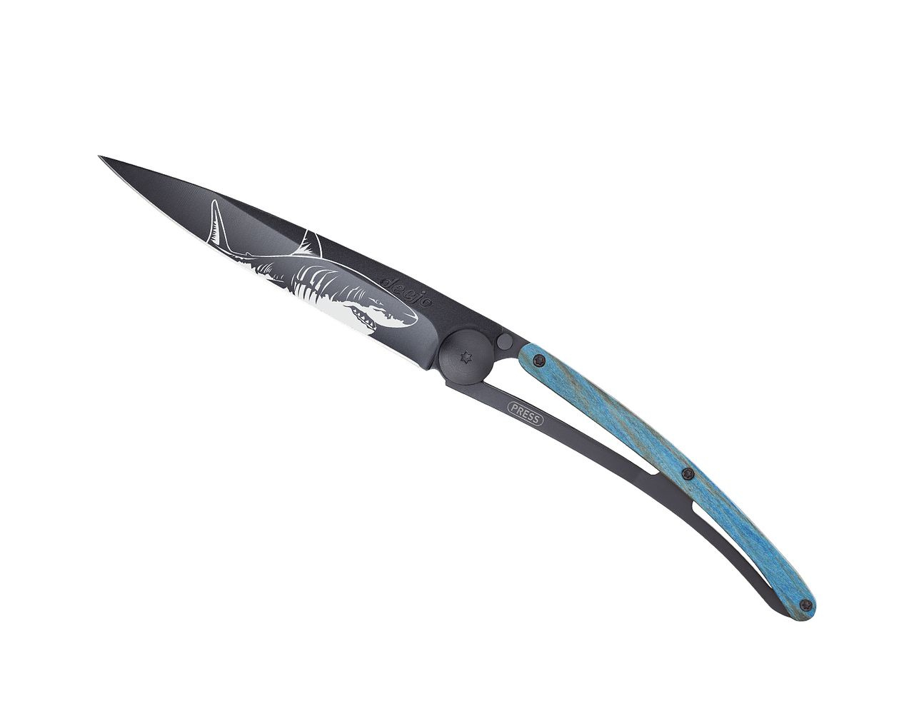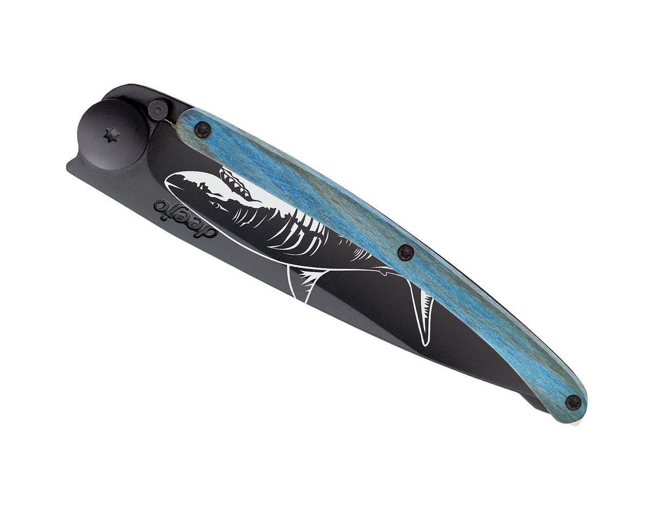 Stylový ultralehký nůž Deejo se střenkou z modře mořeného bukového dřeva a motivem žraloka.