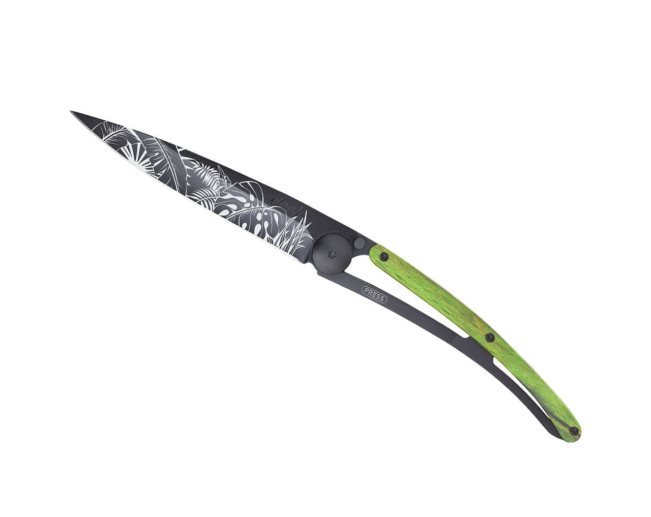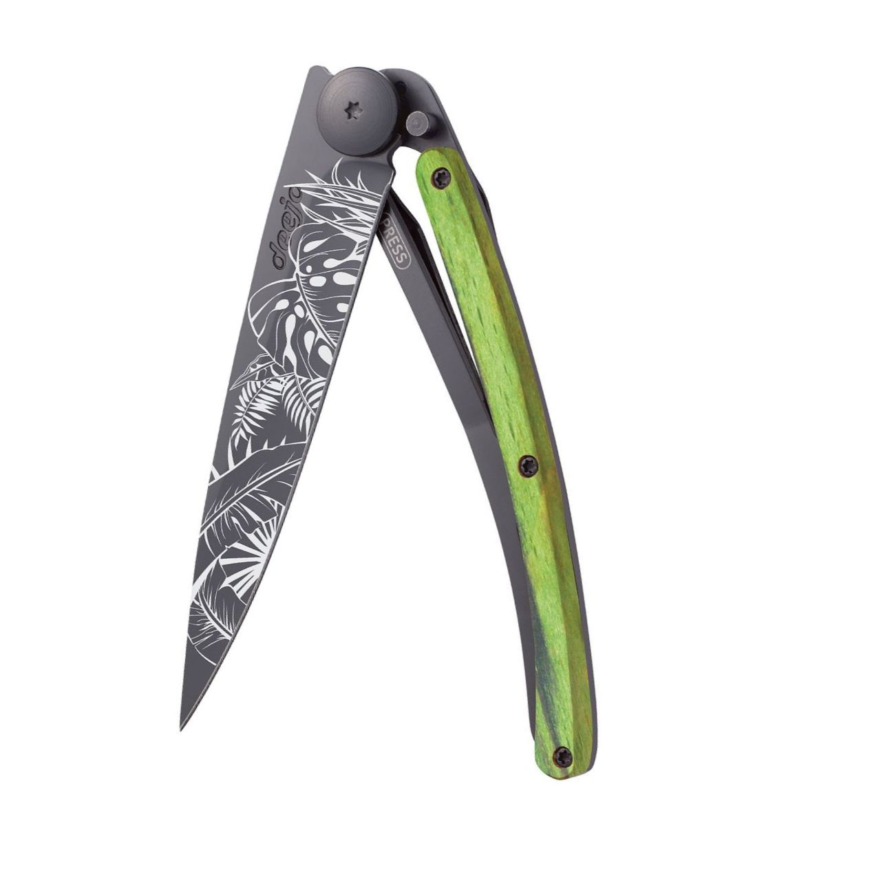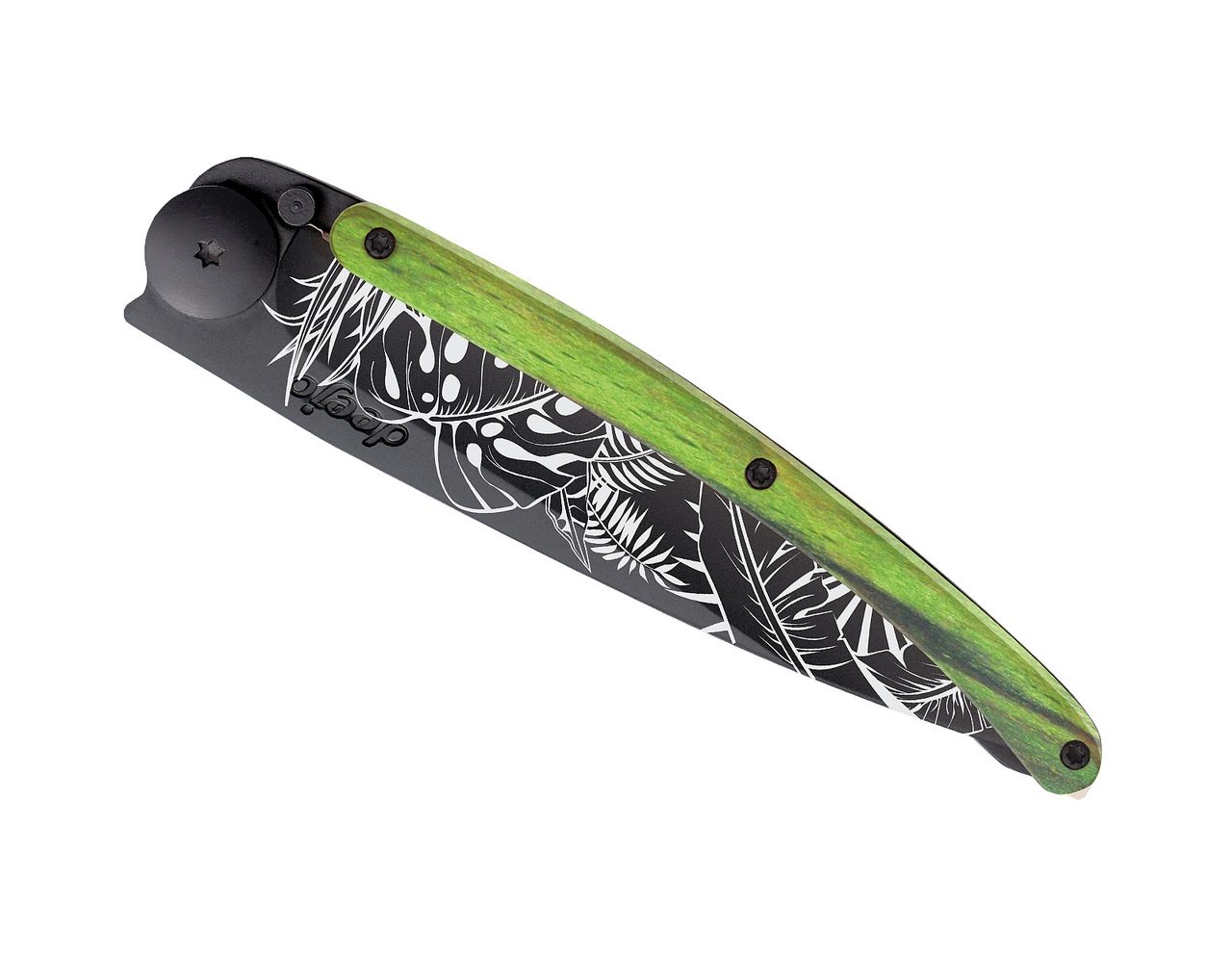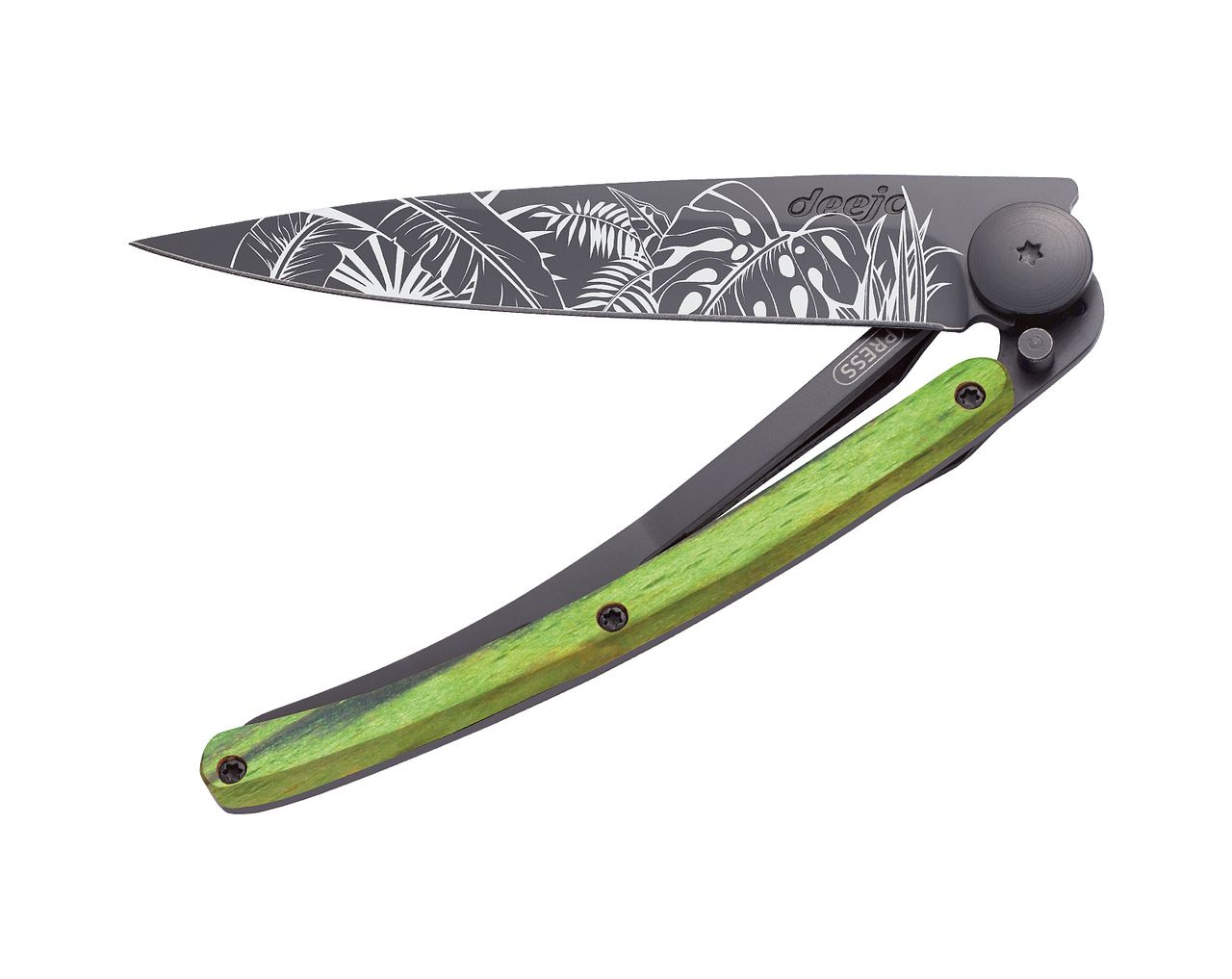 Stylový ultralehký nůž Deejo se střenkou ze zeleně mořeného bukového dřeva a motivem "džungle".