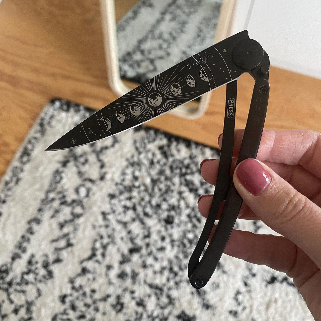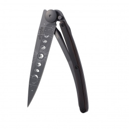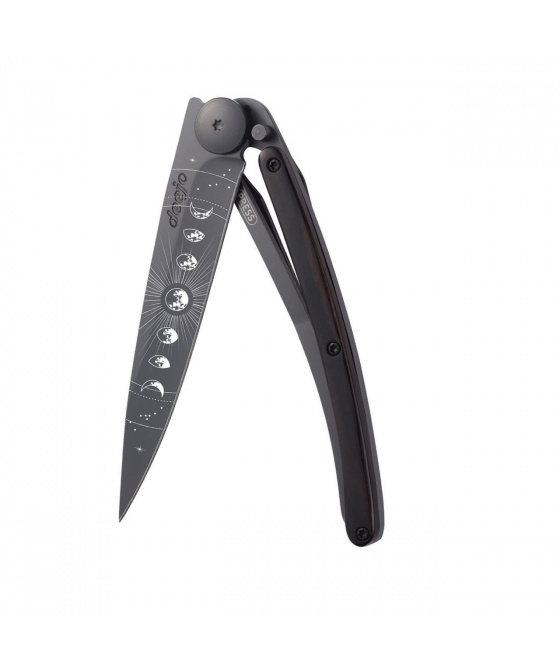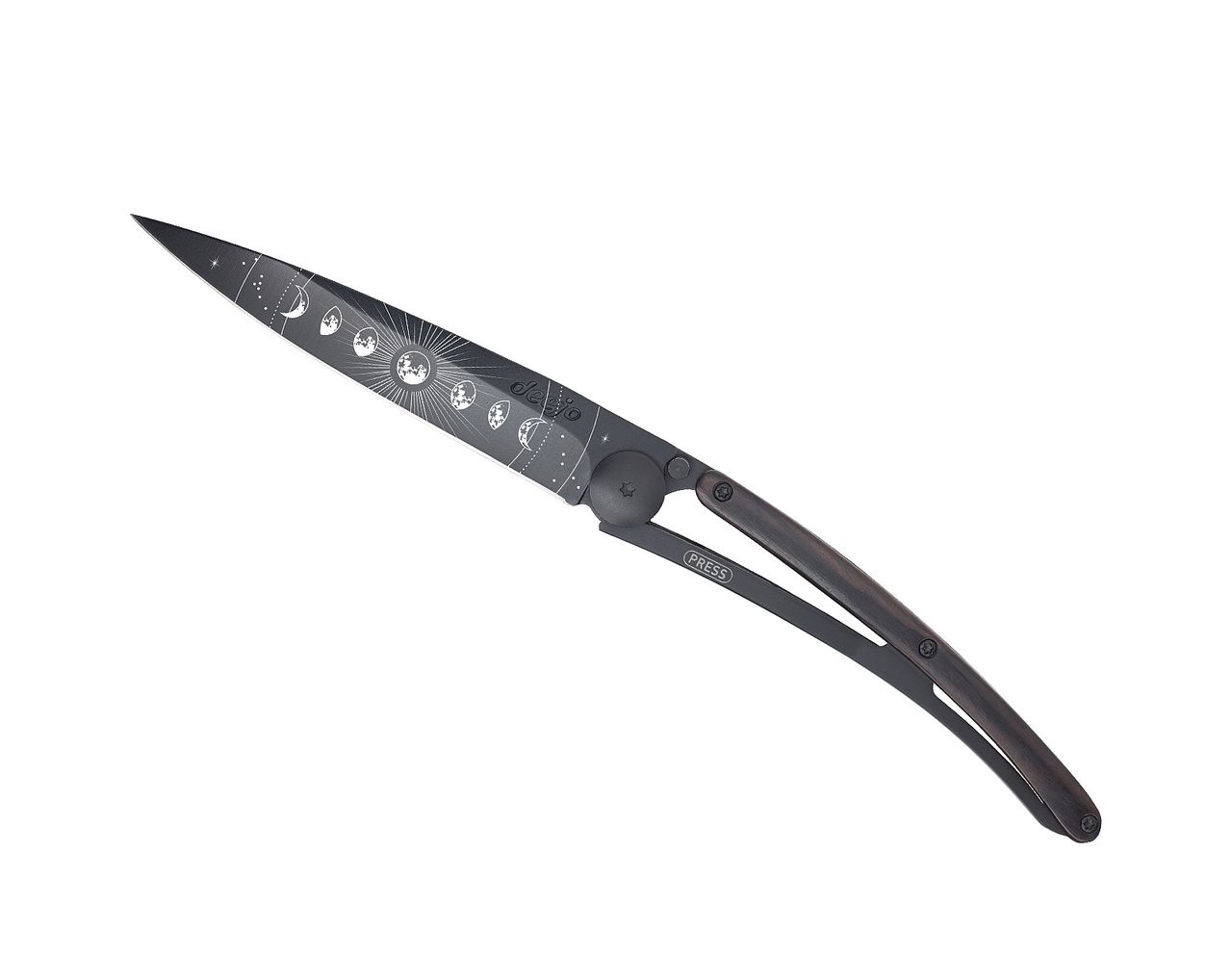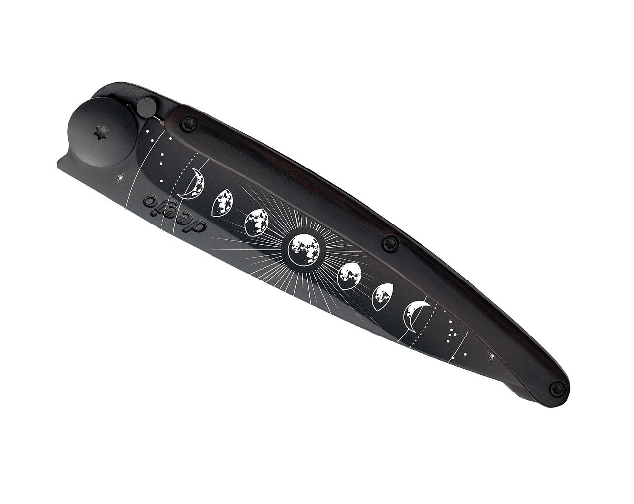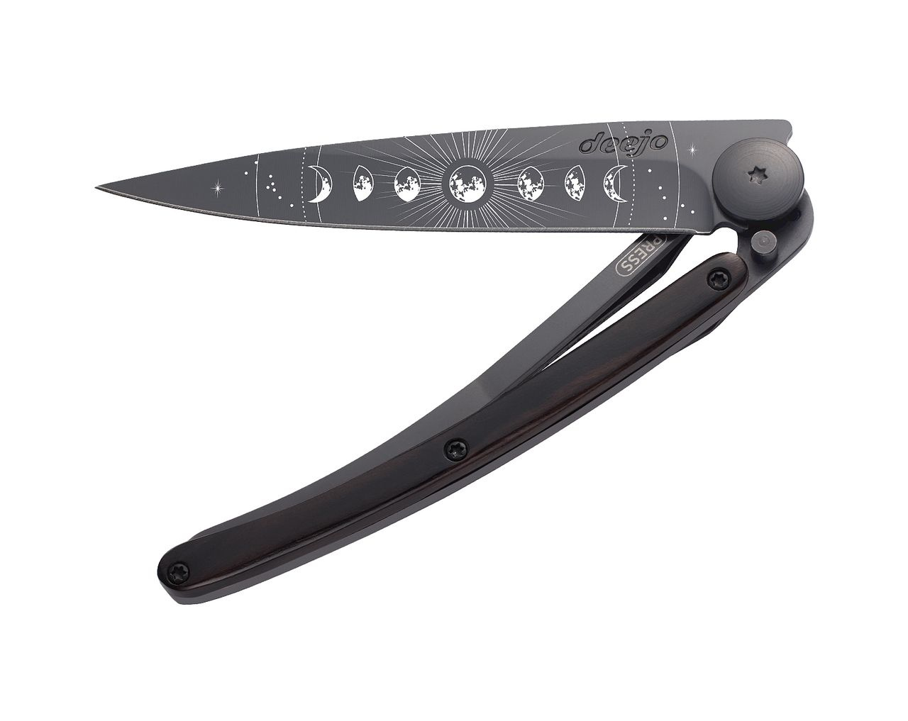 Stylový ultralehký nůž Deejo se střenkou z ebenového dřeva a motivem fáze měsíce.Více