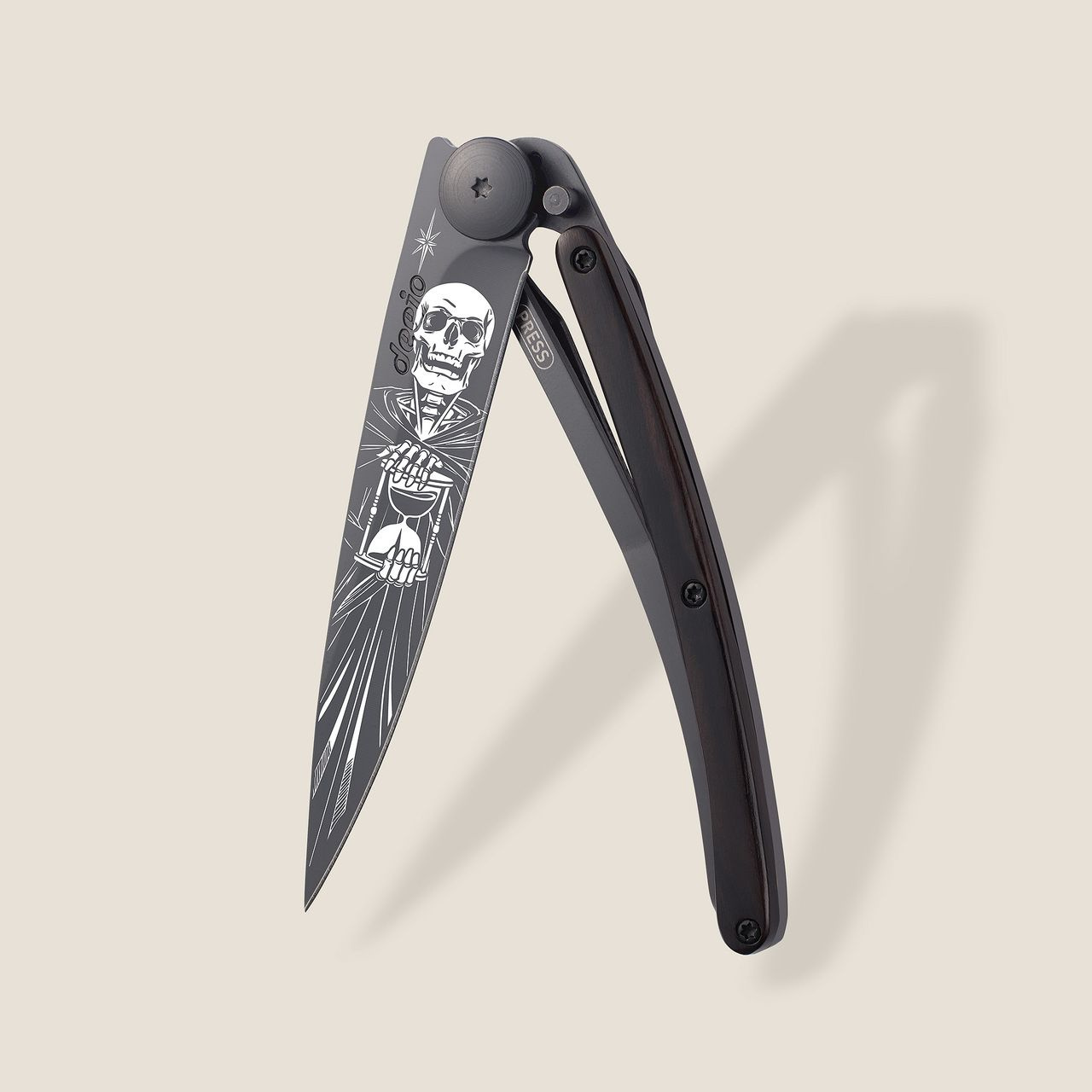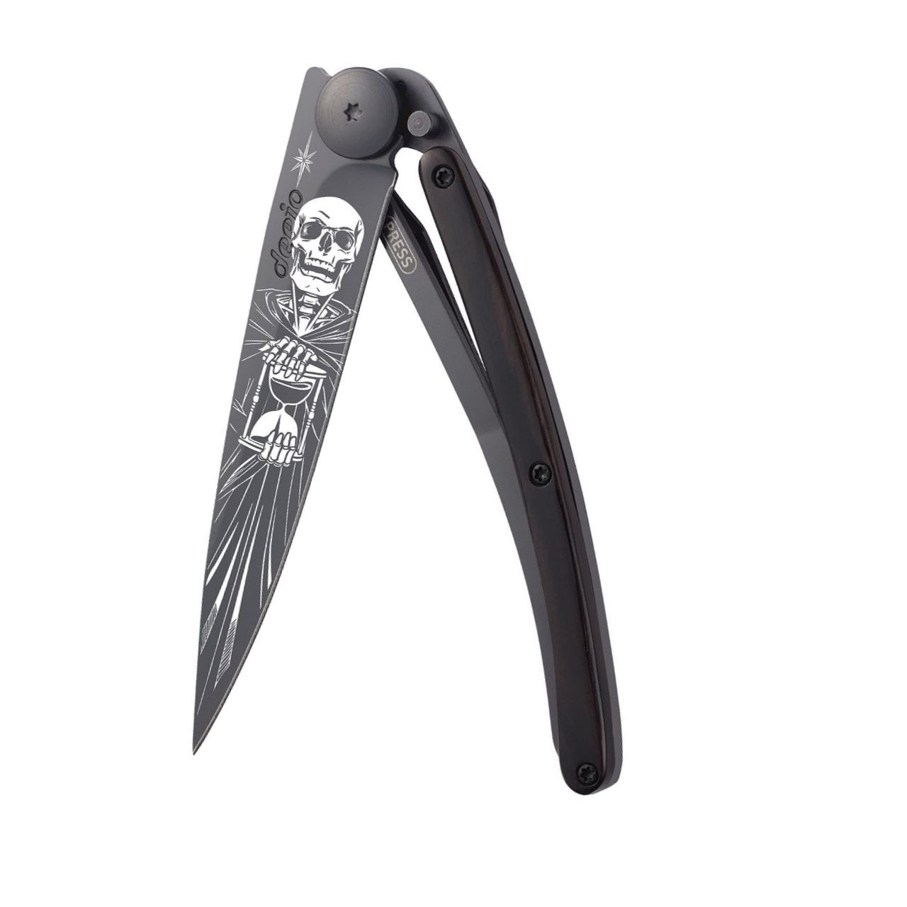 Stylový ultralehký nůž Deejo se střenkou z ebenového dřeva a motivem nesmrtelnosti.