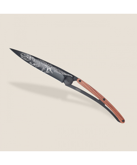 Stylový ultralehký nůž Deejo se střenkou z přírodního dřeva coralwood a tetováním "T-REX'