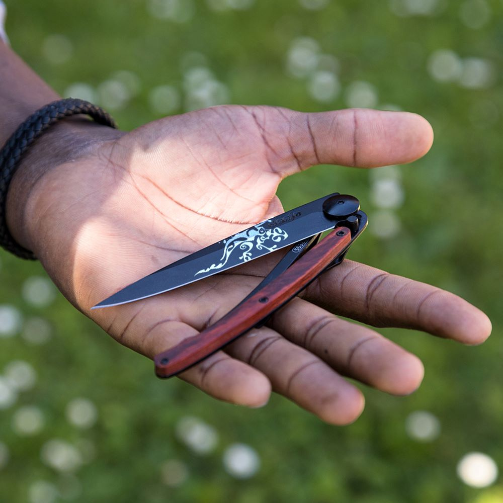 Stylový ultralehký nůž Deejo se střenkou z exotické dřeviny coralwood a motivem gekona.