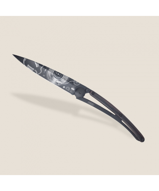 Stylový ultralehký nůž Deejo se střenkou z ebenového dřeva a motivem vinylové desky.