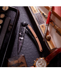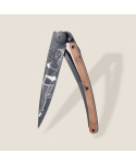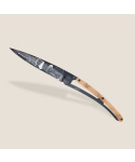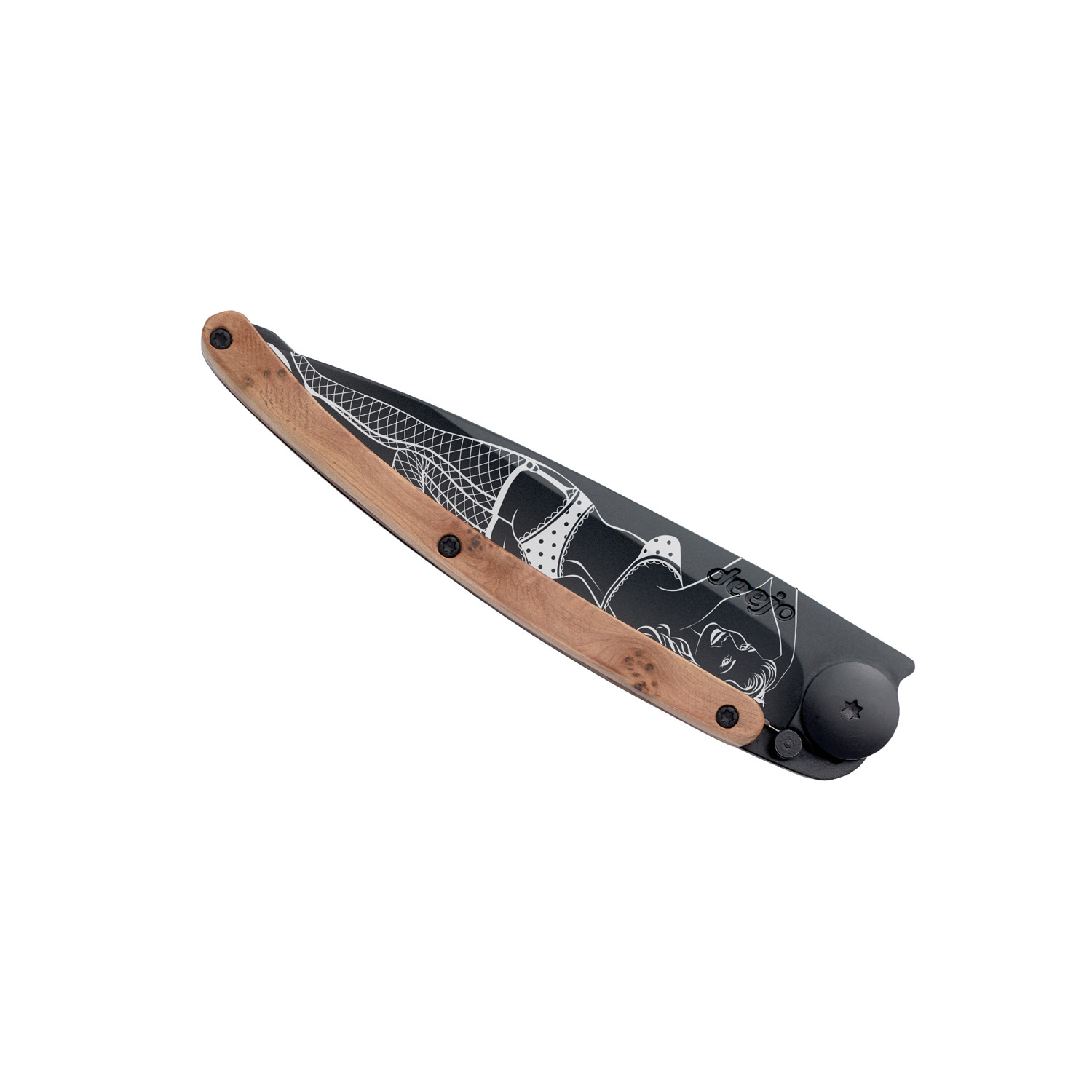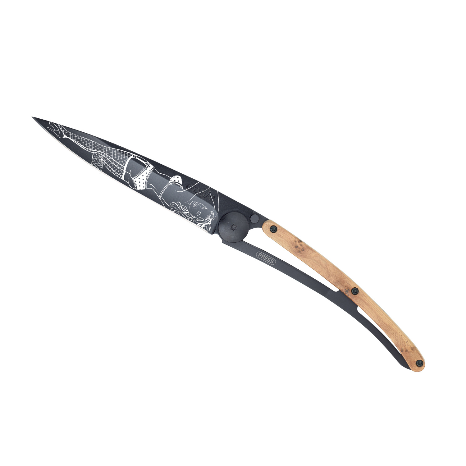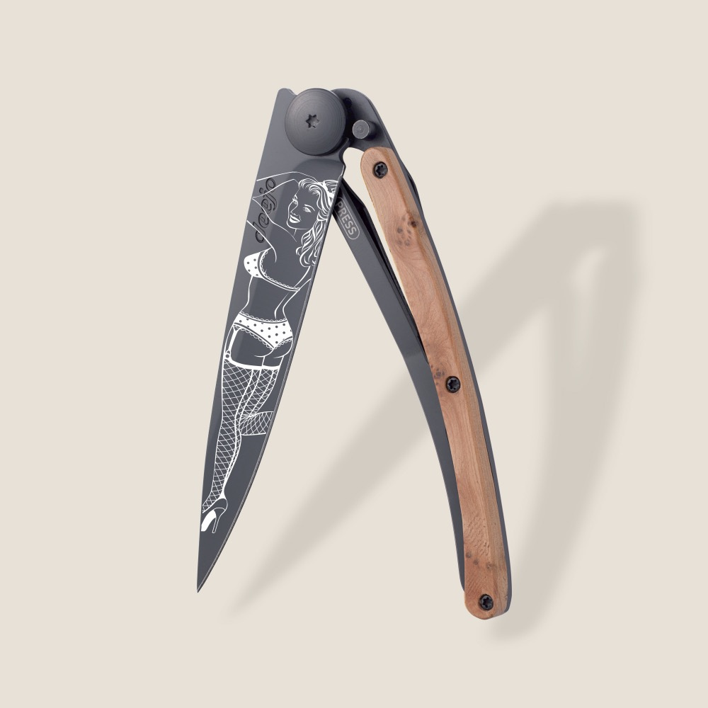 Stylový ultralehký nůž Deejo se střenkou z kořene exotického jalovce a motivem Pin Up.