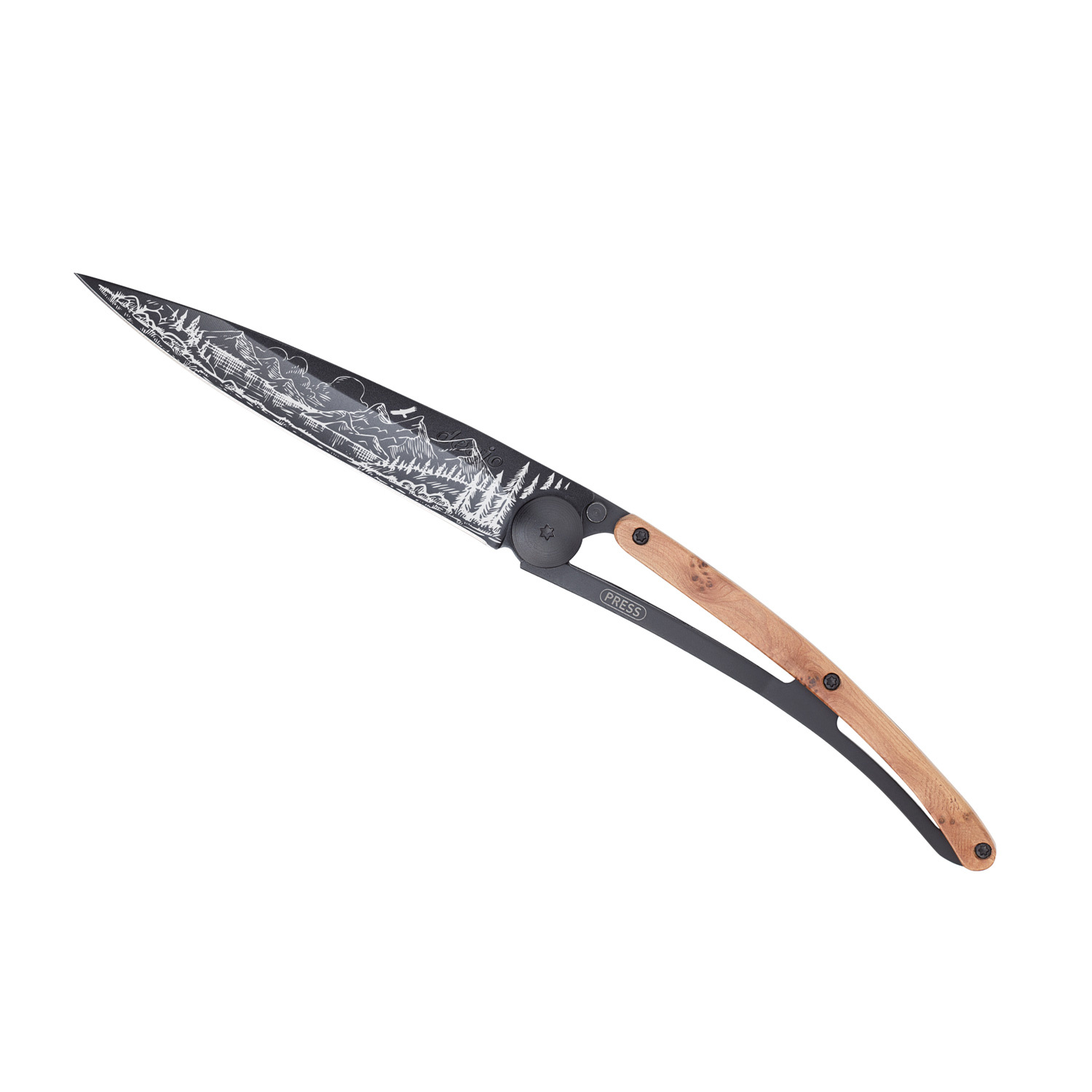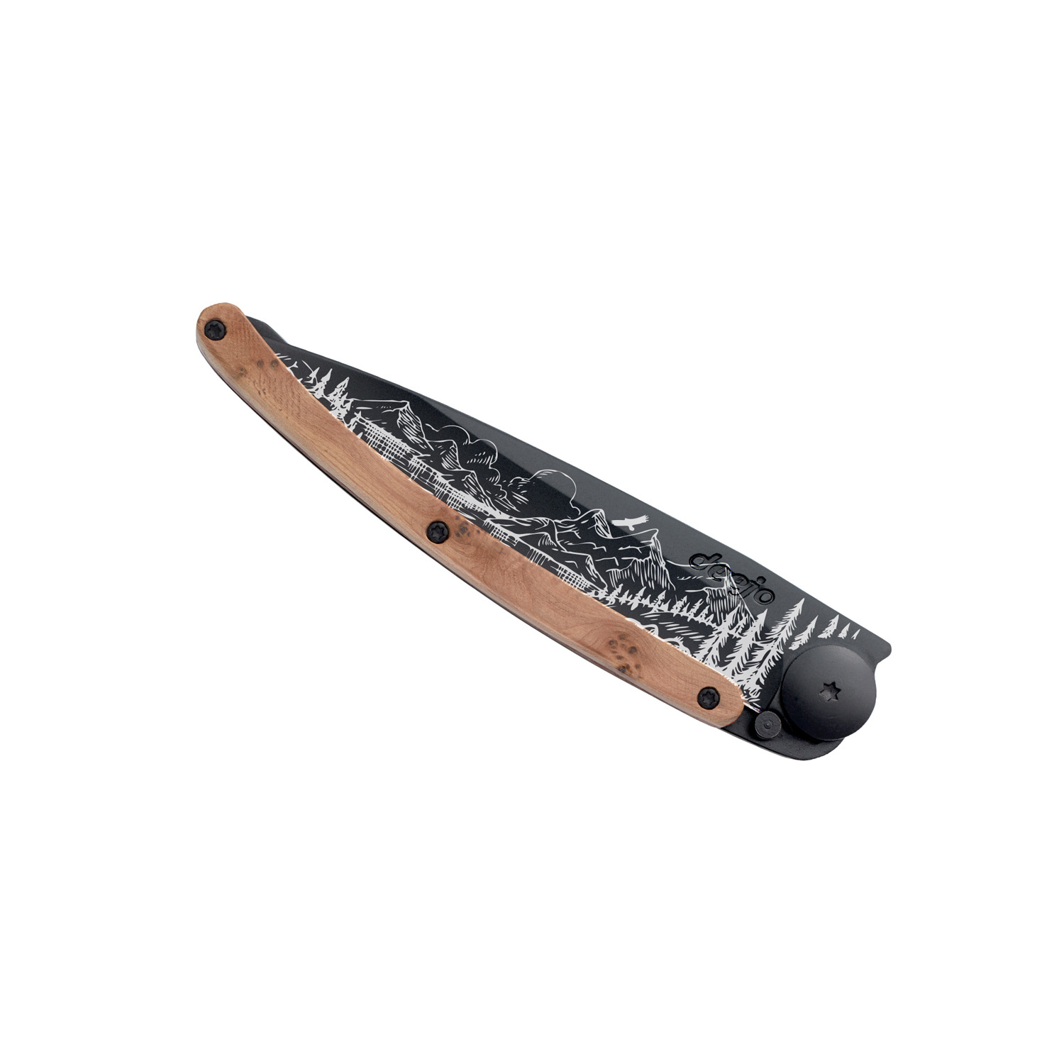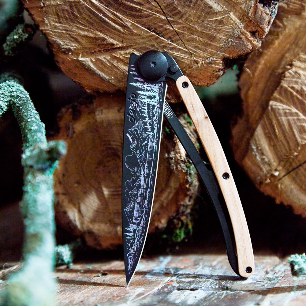 Stylový ultralehký nůž Deejo se střenkou z kořene exotického jalovce a motivem horské scenérie.