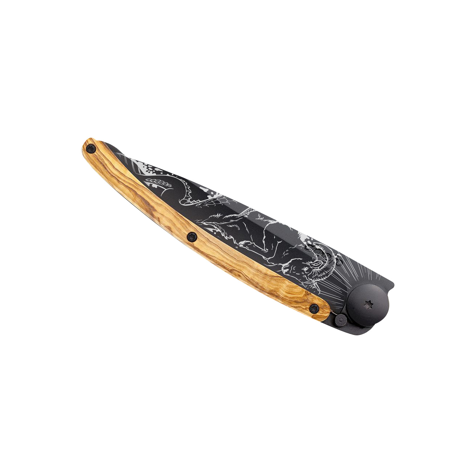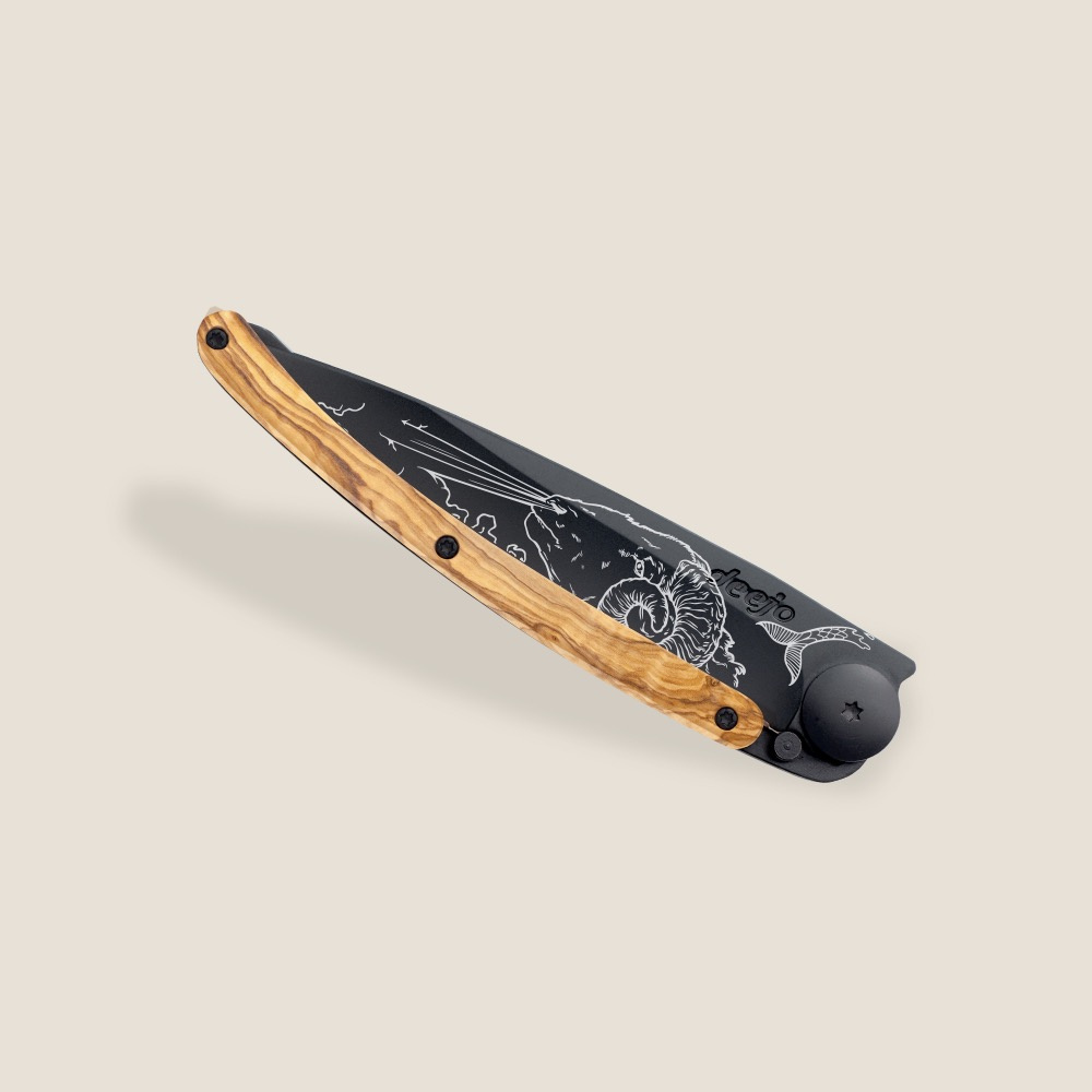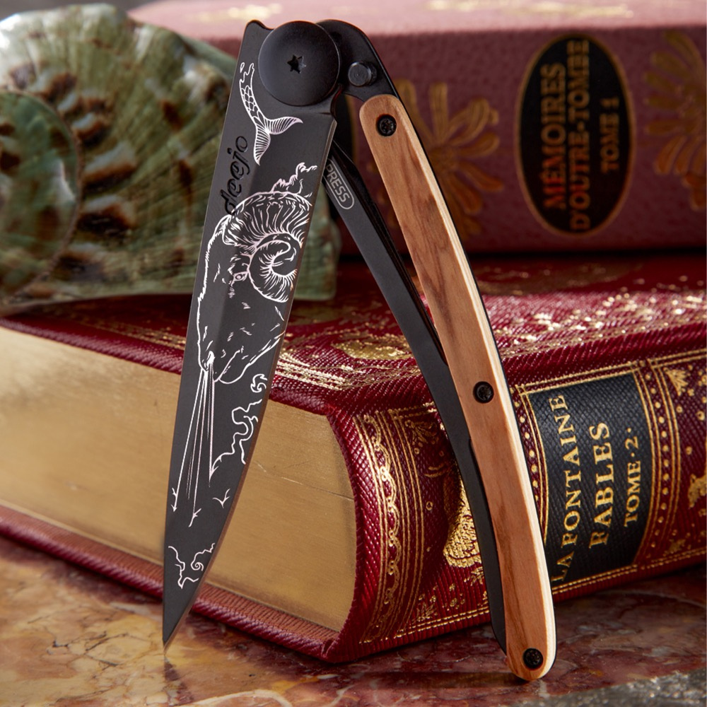 Stylový ultralehký nůž Deejo z kolekce Zodiac se střenkou z olivového dřeva a motivem znamení kozoroha.