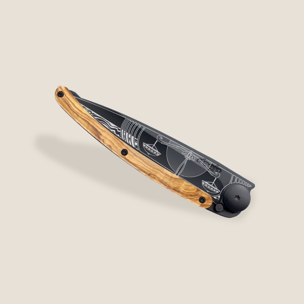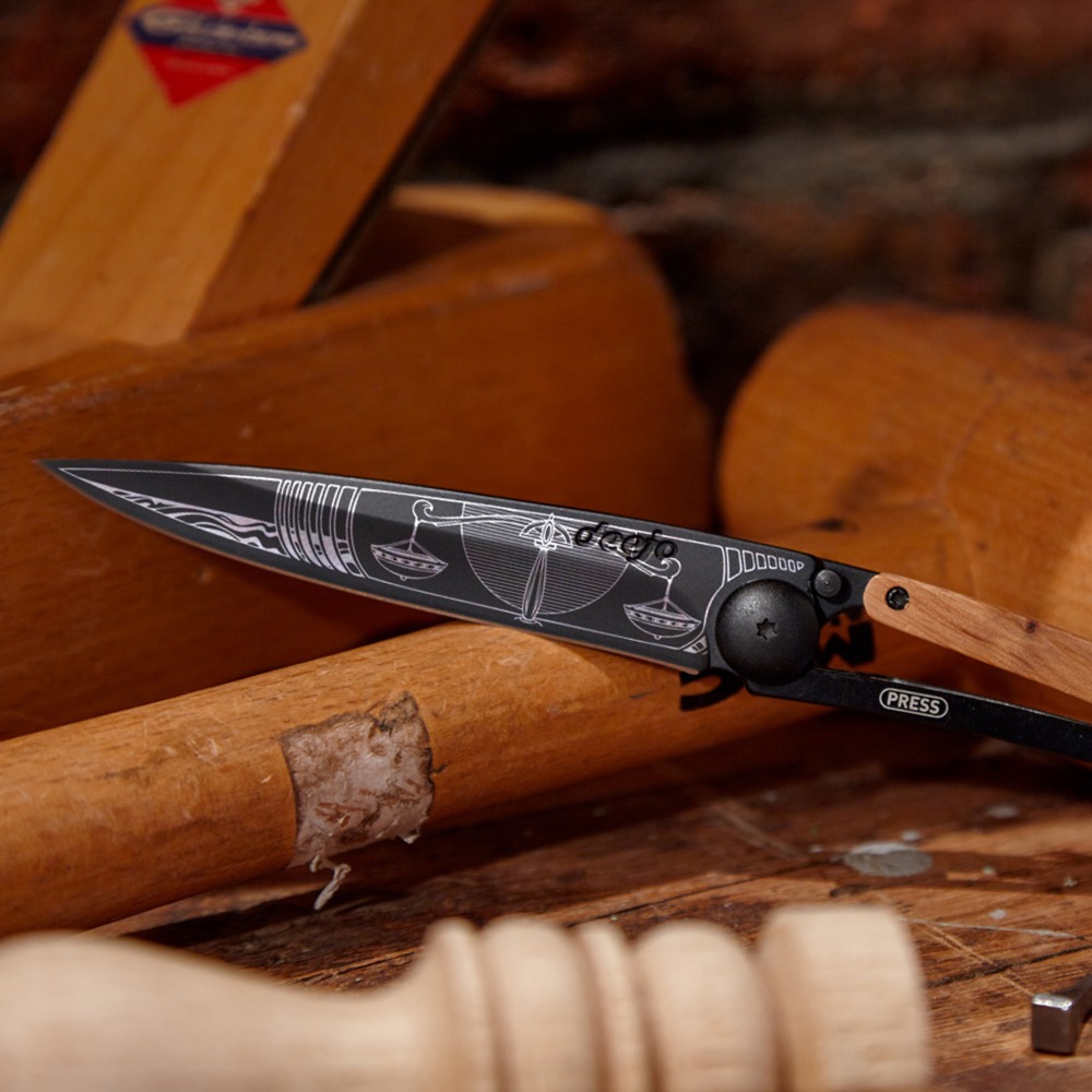 Stylový ultralehký nůž Deejo z kolekce Zodiac se střenkou z olivového dřeva a motivem znamení váhy.