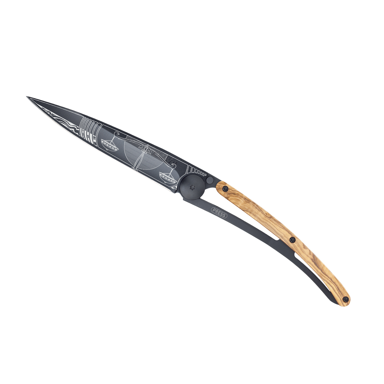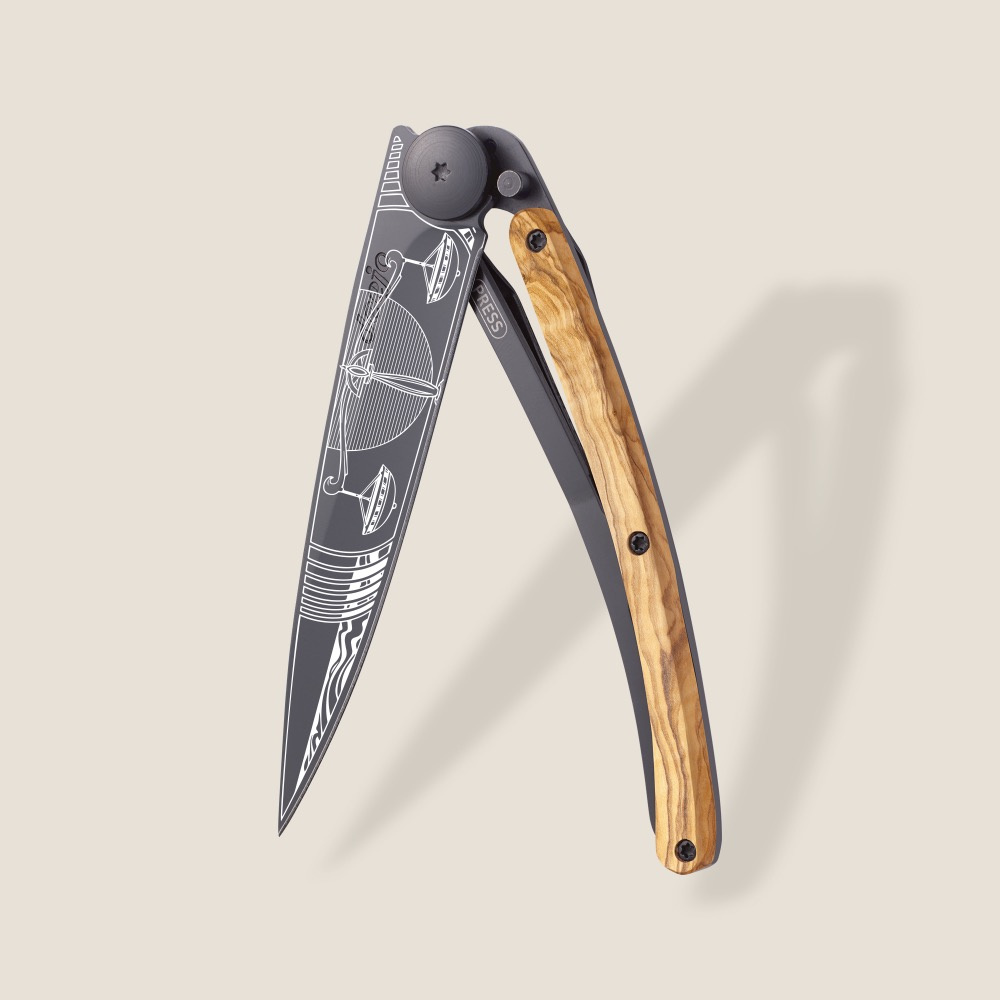 Stylový ultralehký nůž Deejo z kolekce Zodiac se střenkou z olivového dřeva a motivem znamení váhy.Více
