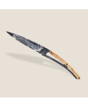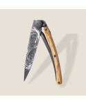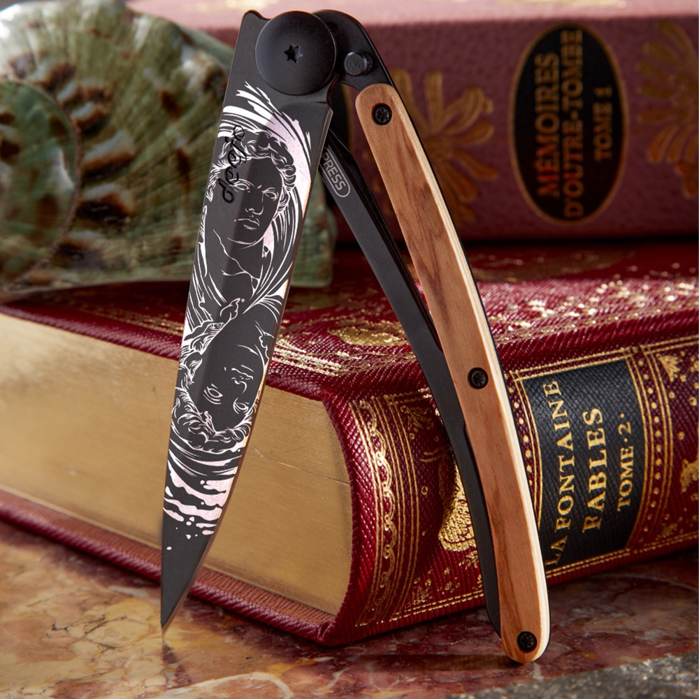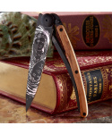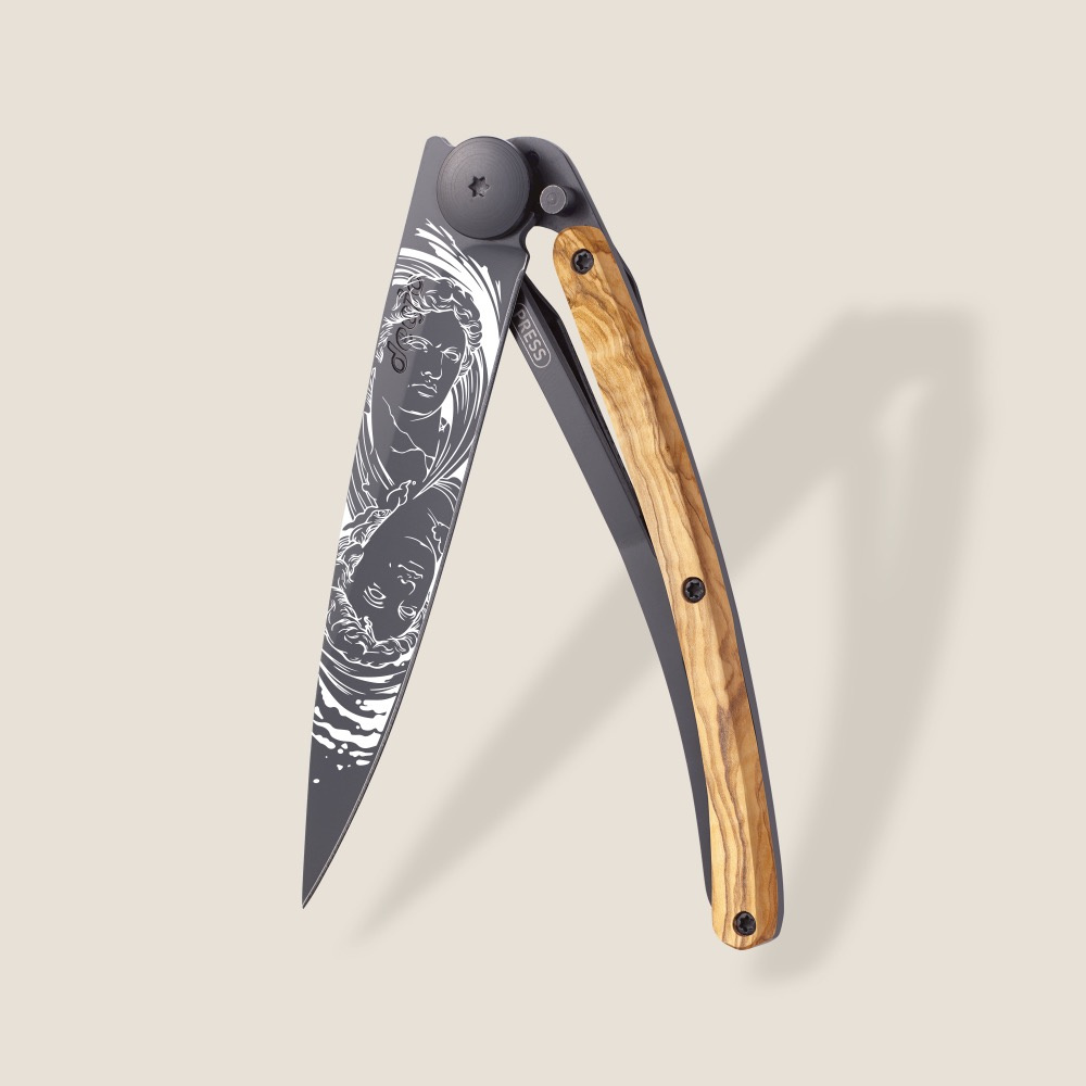 Stylový ultralehký nůž Deejoz kolekce Zodiac se střenkou z olivového dřeva a motivem znamení blíženců.