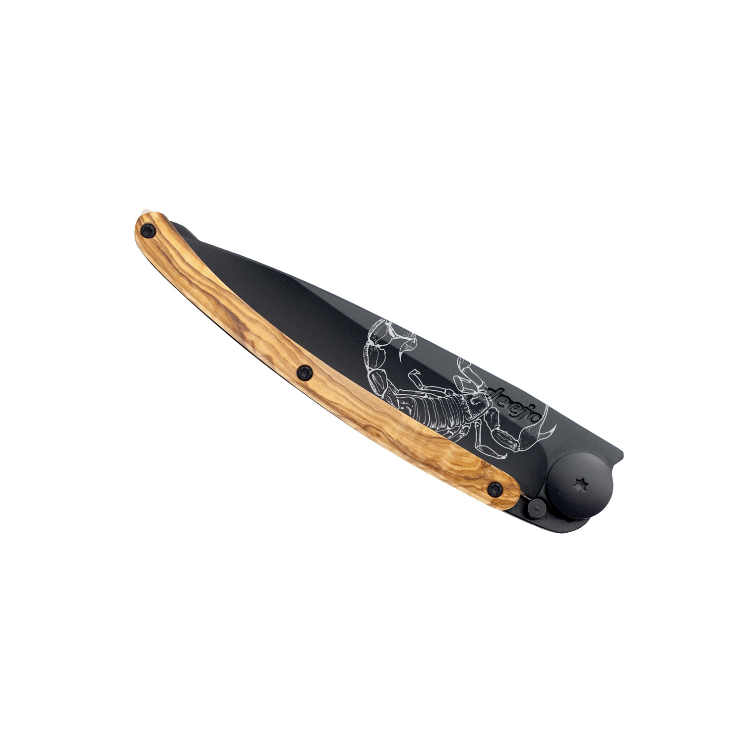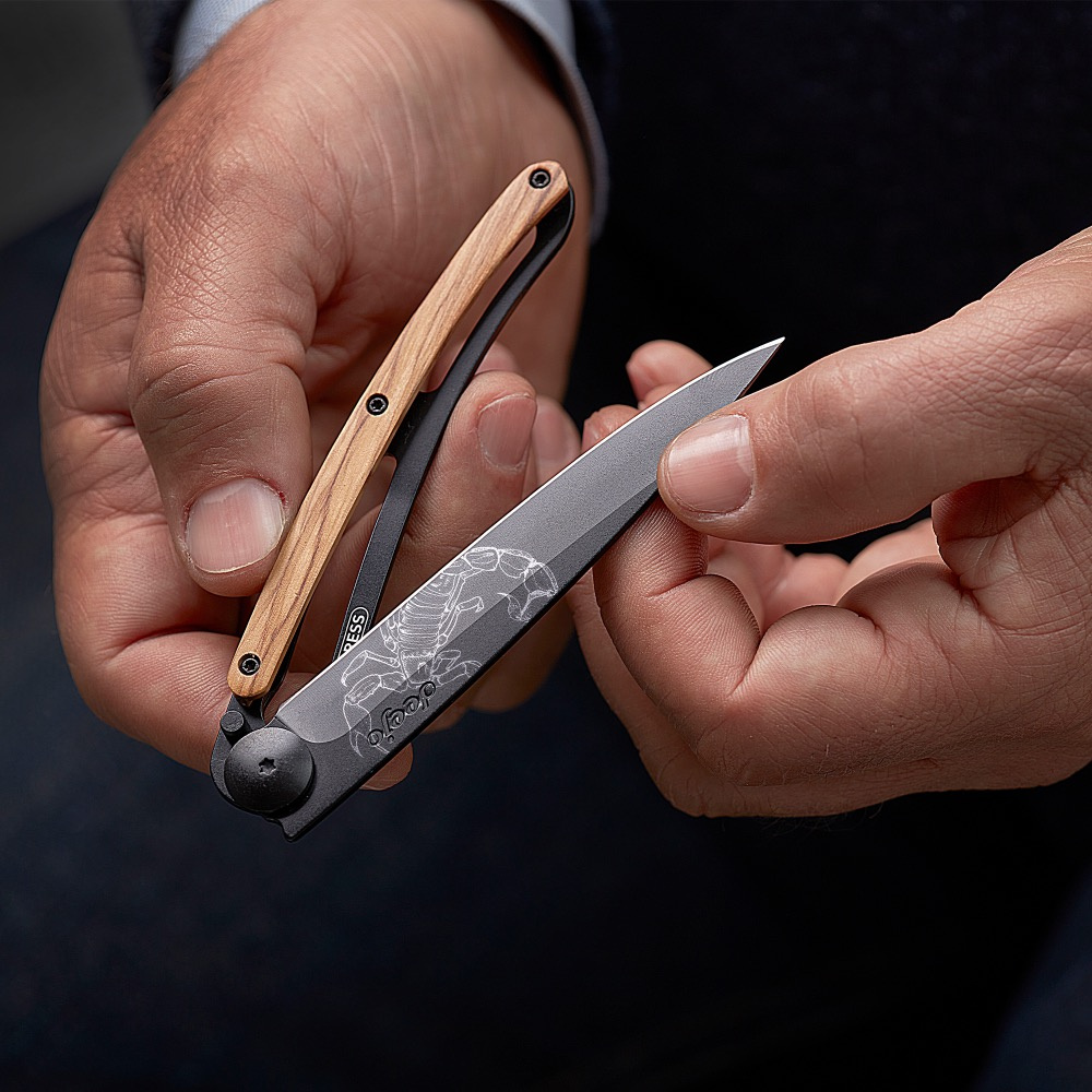 Stylový ultralehký nůž Deejo z kolekce Zodiac se střenkou z olivového dřeva a motivem znamení štíra.