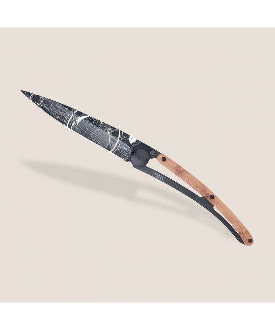 Stylový ultralehký nůž Deejo se střenkou z kořene exotického jalovce a motivem Globetrotter.