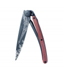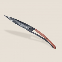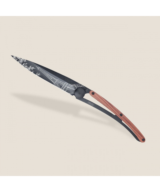Stylový ultralehký nůž Deejo se střenkou z exotické dřeviny coralwood a motivem Eiffelovy věže.