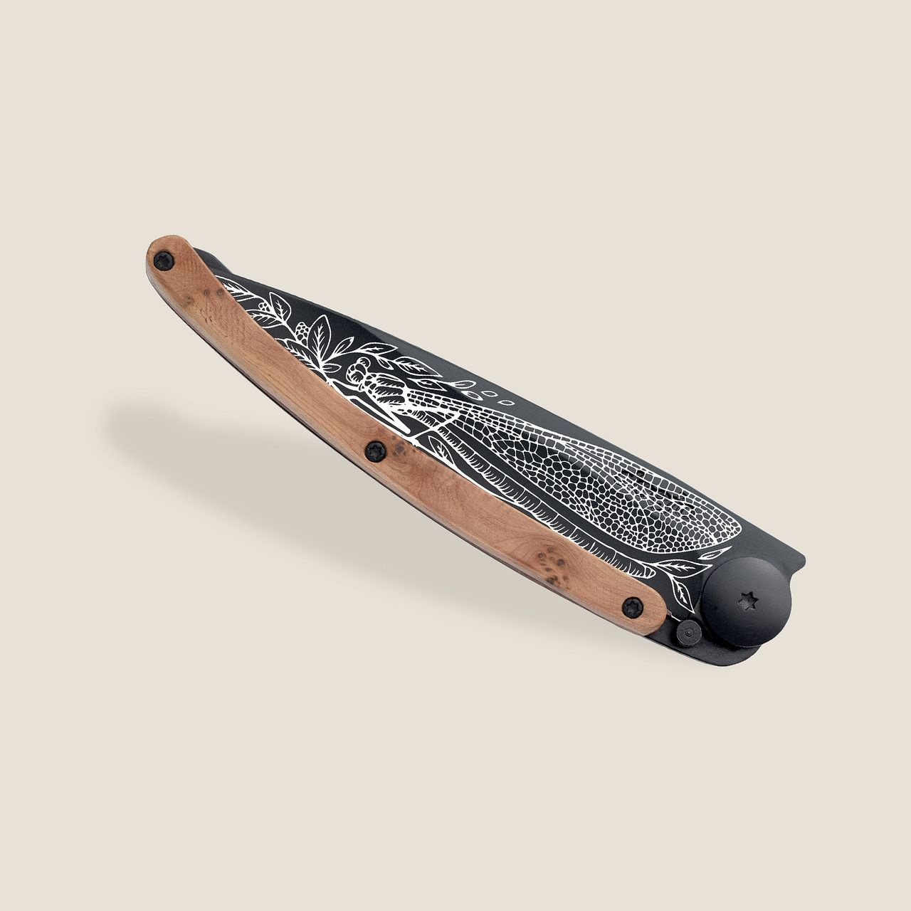 Stylový ultralehký nůž Deejo se střenkou z kořene exotického jalovce a s tetováním čepele.