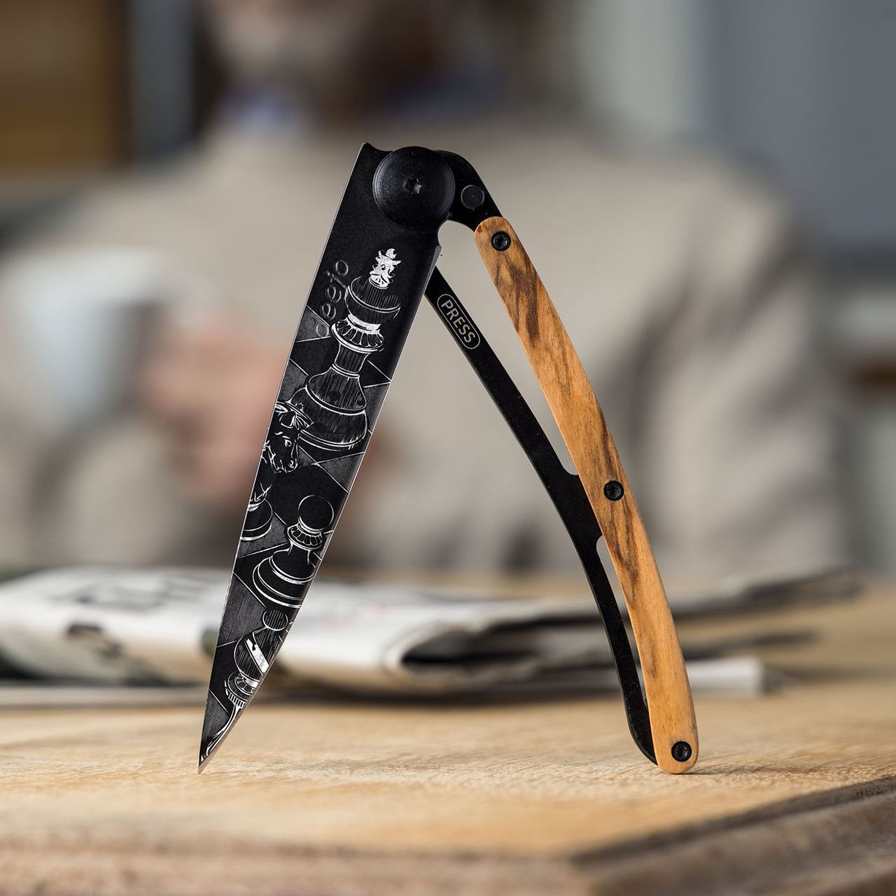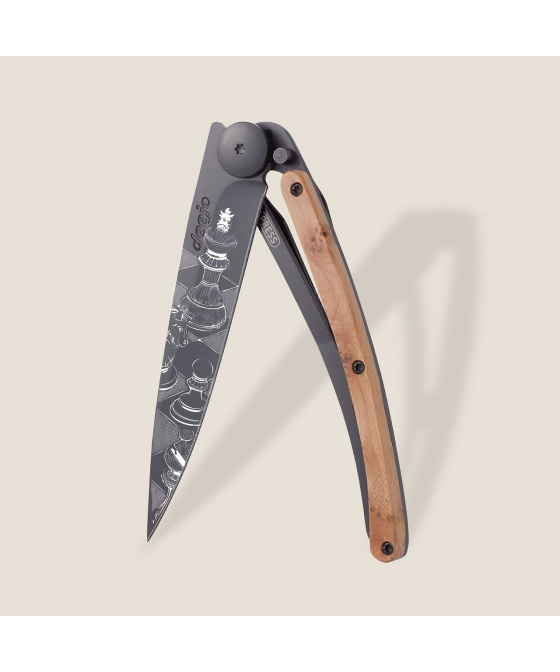 Stylový ultralehký nůž Deejo se střenkou z kořene exotického jalovce a motivem šachů.