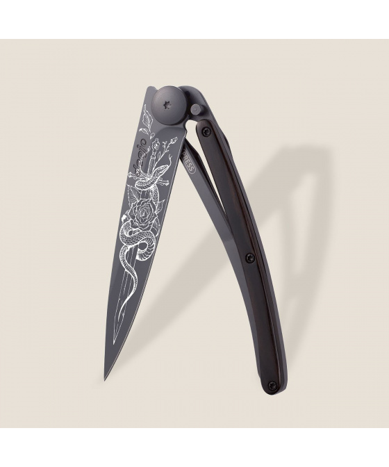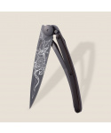 Stylový ultralehký nůž Deejo se střenkou z ebenového dřeva a motivem glaive.