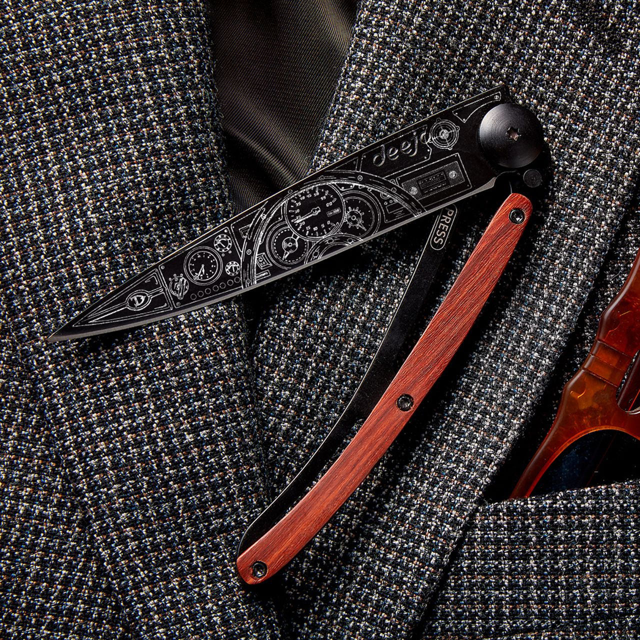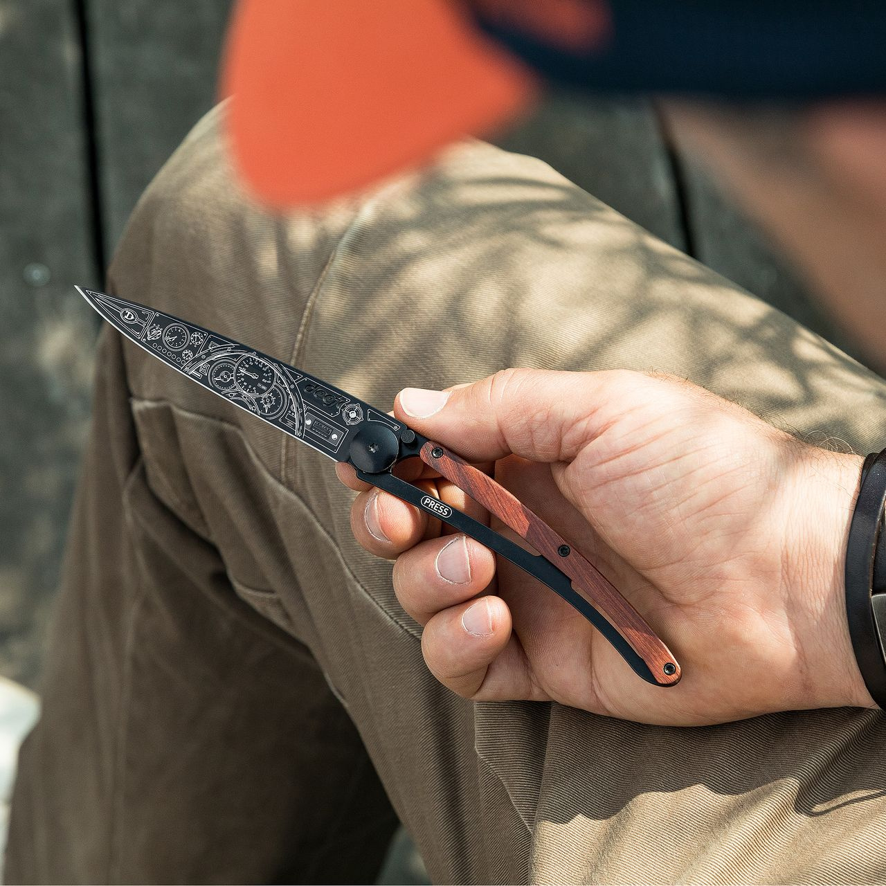 Stylový ultralehký nůž Deejo se střenkou z přírodního dřeva coralwood a tetováním Dials.