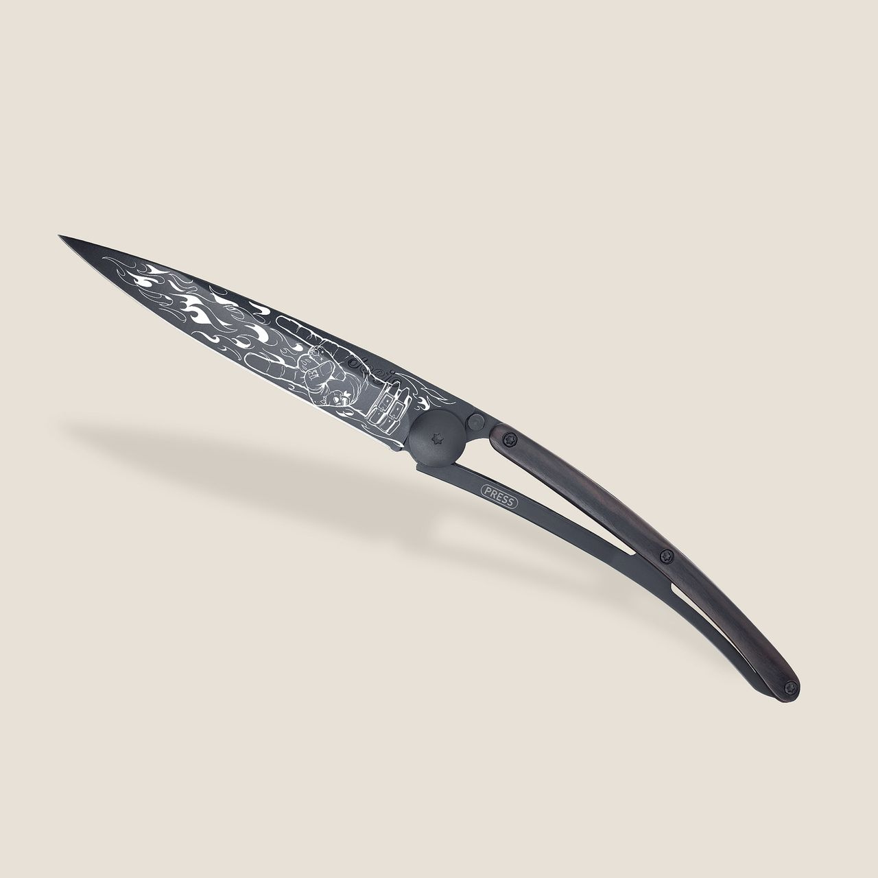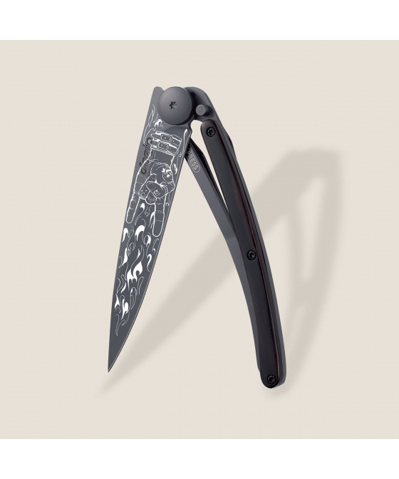 <p>Stylový ultralehký nůž Deejo se střenkou z ebenového dřeva a čepelí s tetováním "rohaté ruky".</p>