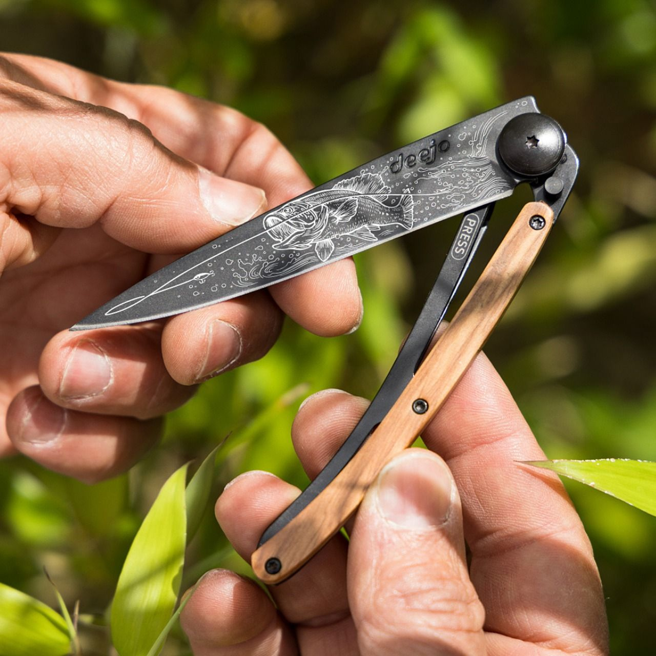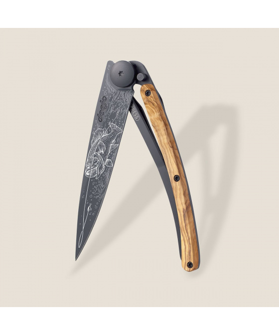 <p>Stylový ultralehký nůž Deejo se střenkou z olivového dřeva a motivem okouna.</p>