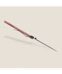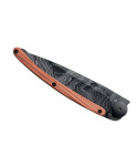 Decentní provedení s motivem vrstevnic, výraznou rukojetí, kolíkem pro jednoruční otevírání čepele a částečně zubatým ostřím.